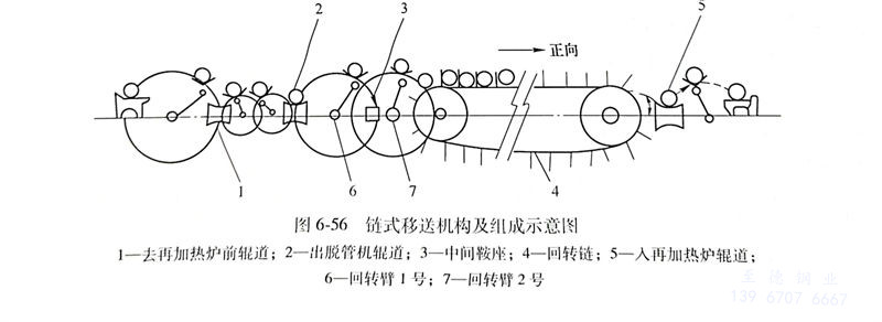 中間(jian)冷(leng)床(chuang)(chuang)(chuang)冷(leng)卻(que)的(de)目(mu)的(de)是(shi)將出連軋(ya)機(ji)(脫管(guan)機(ji))的(de)荒(huang)(huang)管(guan)冷(leng)卻(que)至Ar,溫(wen)度(du)以(yi)下(xia)(見圖6-57),同時在冷(leng)卻(que)的(de)過程中防(fang)止鋼管(guan)彎(wan)(wan)曲,中間(jian)冷(leng)床(chuang)(chuang)(chuang)采(cai)用(yong)雙向鏈(lian)式(shi)移送(song)機(ji)構如圖6-56所示(shi),正向鏈(lian)的(de)作用(yong)是(shi)以(yi)一定(ding)的(de)間(jian)隔時間(jian)帶動鋼管(guan)向冷(leng)床(chuang)(chuang)(chuang)另一端(duan)旋(xuan)轉(zhuan)前進直至將不銹鋼管(guan)冷(leng)卻(que)至Ar,溫(wen)度(du)以(yi)下(xia),然后(hou)撥入(ru)再加(jia)(jia)熱爐的(de)入(ru)爐輥(gun)道被送(song)入(ru)再加(jia)(jia)熱爐(圖6-58),反向鏈(lian)的(de)作用(yong)是(shi)帶動荒(huang)(huang)管(guan)以(yi)一定(ding)的(de)速度(du)旋(xuan)轉(zhuan),防(fang)止荒(huang)(huang)管(guan)彎(wan)(wan)曲。鏈(lian)式(shi)冷(leng)床(chuang)(chuang)(chuang)與(yu)步(bu)進式(shi)冷(leng)床(chuang)(chuang)(chuang)相比節(jie)奏調整范(fan)圍更(geng)寬,操作靈活,不僅可(ke)用(yong)在在線常化工(gong)藝(yi)的(de)控制冷(leng)卻(que)上(shang),也可(ke)以(yi)用(yong)在其(qi)他熱處理工(gong)藝(yi)的(de)控制冷(leng)卻(que)上(shang)。