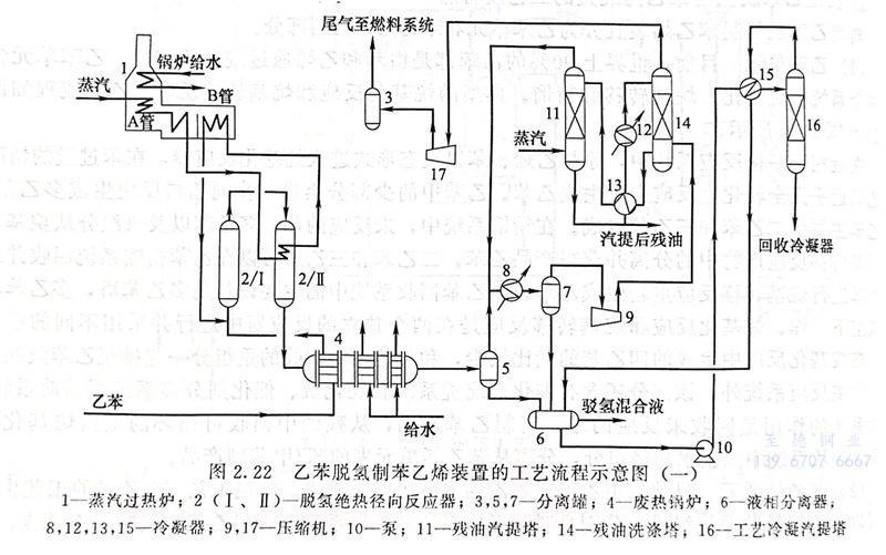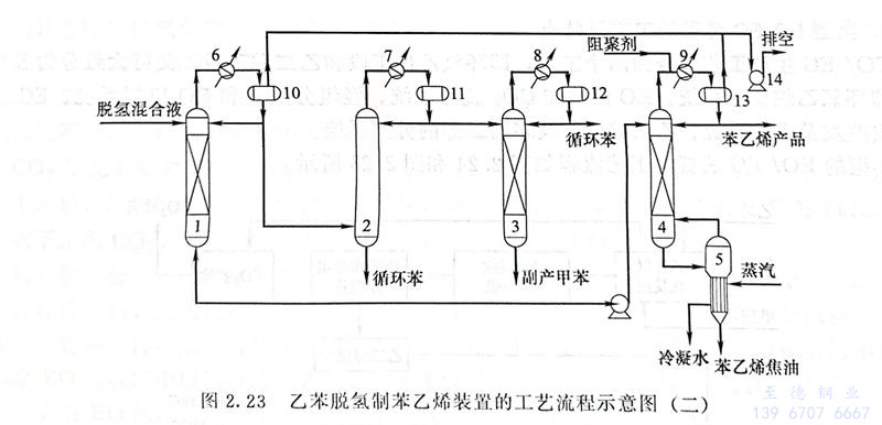 目前,由乙苯制苯乙烯多采用脫氫方法。脫氫工藝制苯乙烯的工藝由兩個可以獨立運轉的系統組成,分別是脫氫反應系統和精餾系統。典型乙苯脫氧制苯乙烯裝置的工藝流程如圖2.22和圖2.23所(suo)示。