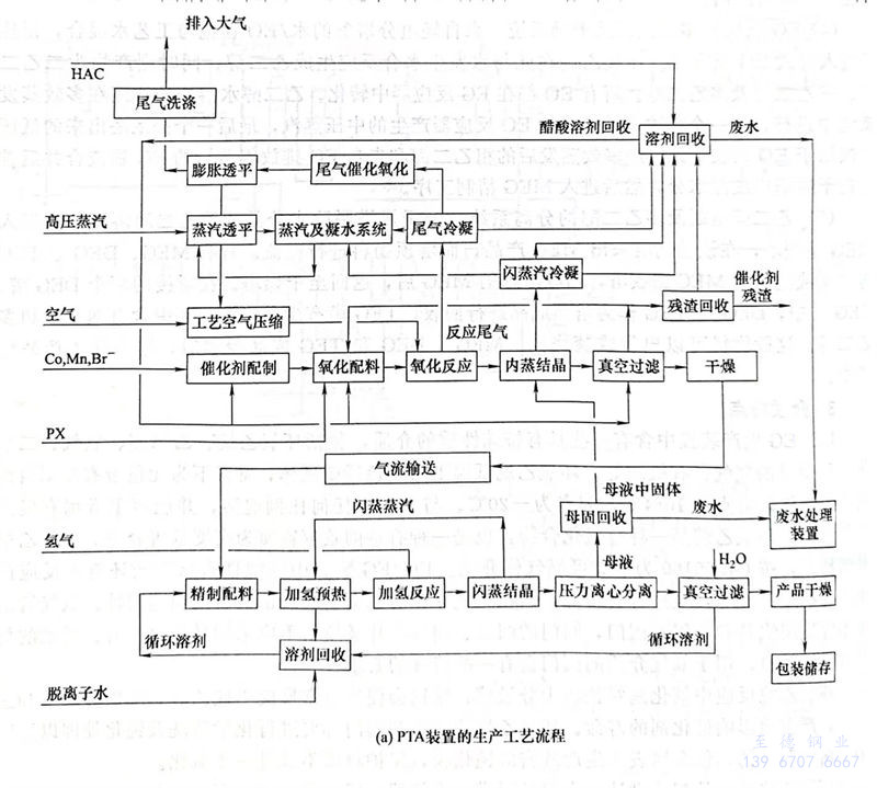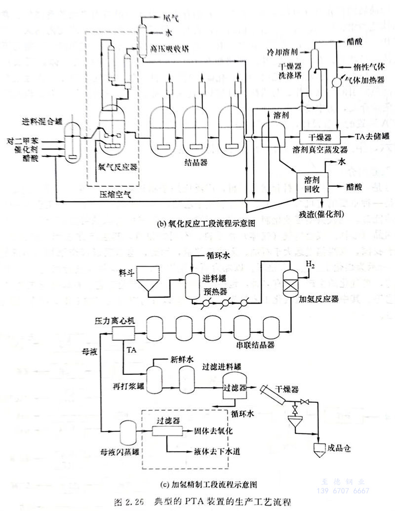 目前世界上普(pu)遍采(cai)用對(dui)(dui)(dui)二(er)甲(jia)苯(PX)空氣氧化(hua)法(fa)工藝。該(gai)工藝一(yi)般由粗(cu)對(dui)(dui)(dui)苯二(er)甲(jia)酸(suan)(suan)(suan)的(de)(de)(de)氧化(hua)生成和對(dui)(dui)(dui)苯二(er)甲(jia)酸(suan)(suan)(suan)的(de)(de)(de)加氫精(jing)(jing)制(zhi)兩(liang)(liang)部分(fen)組成,其中,粗(cu)對(dui)(dui)(dui)苯二(er)甲(jia)酸(suan)(suan)(suan)的(de)(de)(de)氧化(hua)生成又包括氧化(hua)、分(fen)離干燥和醋(cu)酸(suan)(suan)(suan)回收三個(ge)系統。對(dui)(dui)(dui)苯二(er)甲(jia)酸(suan)(suan)(suan)的(de)(de)(de)加氫精(jing)(jing)制(zhi)又包括加氫精(jing)(jing)制(zhi)和分(fen)離干燥兩(liang)(liang)個(ge)系統。典型的(de)(de)(de)PTA裝置的(de)(de)(de)生產(chan)工藝流程如圖2.26所(suo)示。