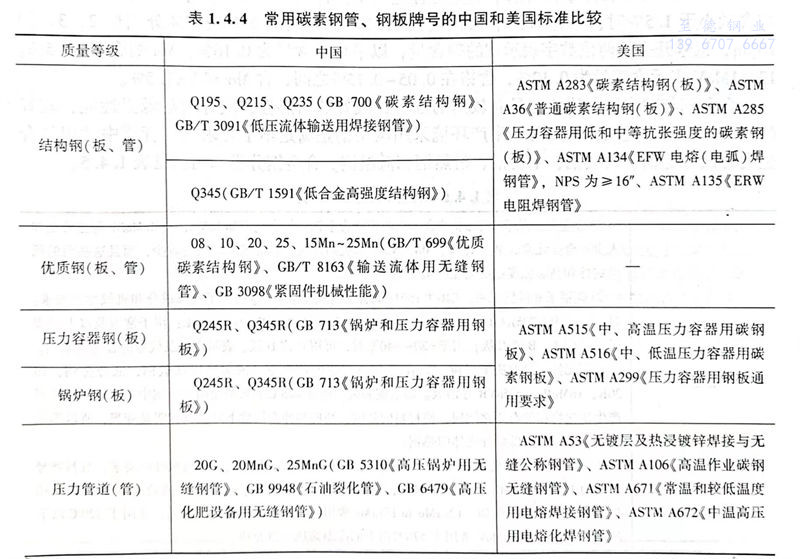 常用碳素鋼管、鋼板牌號的中(zhong)國和美國標(biao)準比(bi)較(jiao)見表1.4.4。