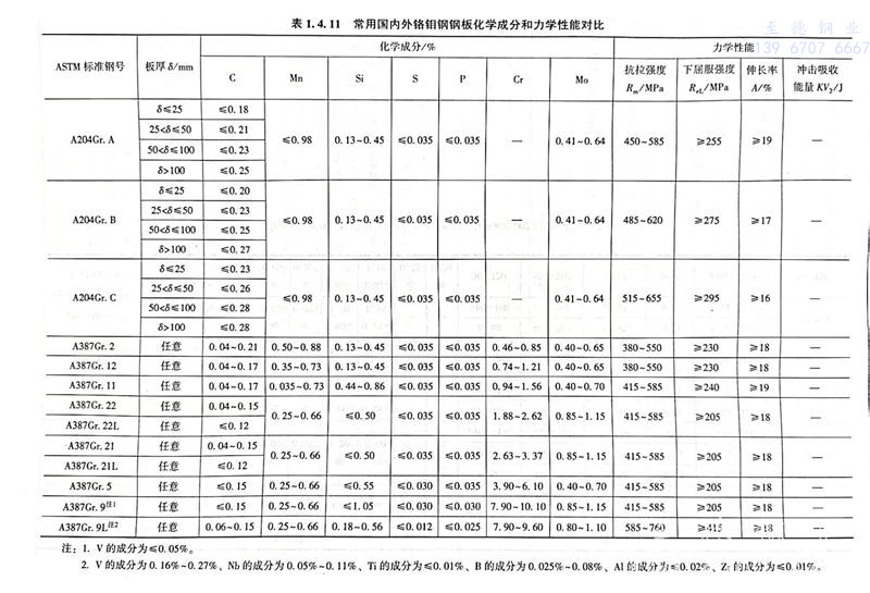 常(chang)用國內外鉻鉬(mu)鋼鋼板(ban)化學成分和力學性(xing)能對(dui)比見表1.4.11。