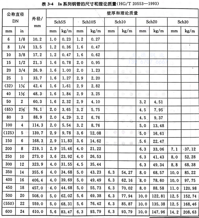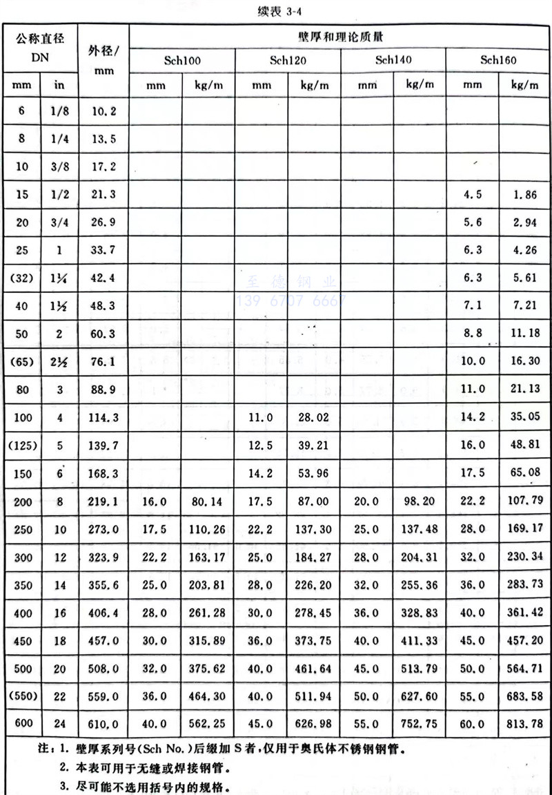 表(biao)3-4中(zhong)(zhong),鋼(gang)管外(wai)徑(jing)等效采(cai)用ISO 4200《焊(han)接和無縫(feng)平端鋼(gang)管尺寸(cun)與單位長(chang)度質(zhi)量總表(biao)》中(zhong)(zhong)的(de)(de)尺寸(cun);壁(bi)厚(hou)(hou)采(cai)用“壁(bi)厚(hou)(hou)系(xi)列號”(英文為 Schedule Number,簡(jian)寫為Sch No.)表(biao)示,壁(bi)厚(hou)(hou)值基本(ben)上采(cai)用ANSI B36.10《焊(han)接和無縫(feng)的(de)(de)軋制(zhi)(zhi)鋼(gang)管》加以圓整,然(ran)后(hou)取(qu) ISO 221《鋼(gang)管壁(bi)厚(hou)(hou)》中(zhong)(zhong)相近的(de)(de)壁(bi)厚(hou)(hou)值。“Sch No.”是(shi)美國(guo)管壁(bi)厚(hou)(hou)的(de)(de)一種(zhong)表(biao)示方法,它并(bing)不(bu)代表(biao)管壁(bi)的(de)(de)實際厚(hou)(hou)度,僅是(shi)管壁(bi)厚(hou)(hou)度系(xi)列的(de)(de)編號,每個(ge)系(xi)列編號對應著從小到(dao)大管徑(jing)的(de)(de)一套固定不(bu)變的(de)(de)厚(hou)(hou)度。當采(cai)用英制(zhi)(zhi)單位時(shi),Sch No.應有以下(xia)關系(xi)式: