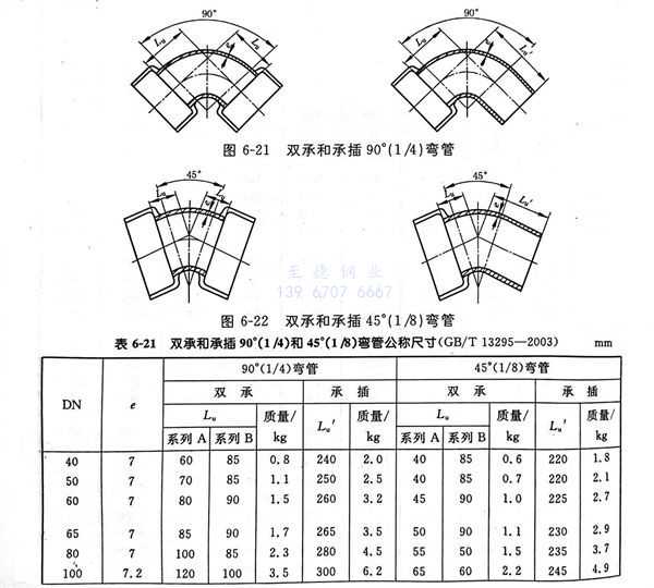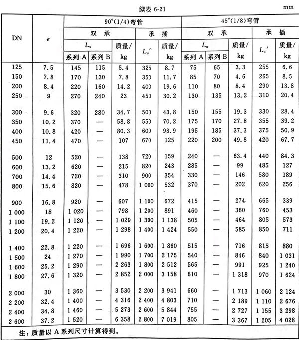 雙承和承插90°(1/4)彎管型(xing)式見圖6-21,尺寸(cun)見表6-21。雙承和承插45°(1/8)彎管型式見圖6-22,尺寸見表(biao)6-21。