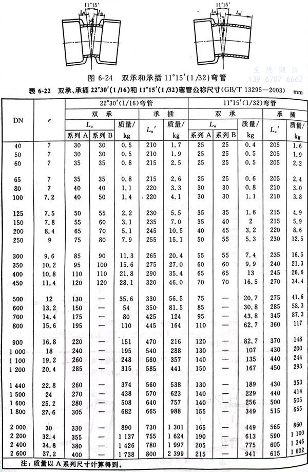 雙承和承插22°30'(1/16)彎管型式見圖6-23,尺寸見表6-22。雙承(cheng)和(he)承(cheng)插11°15'(1/32)彎管型式見(jian)圖6-24,尺寸(cun)見(jian)表(biao)6-22。