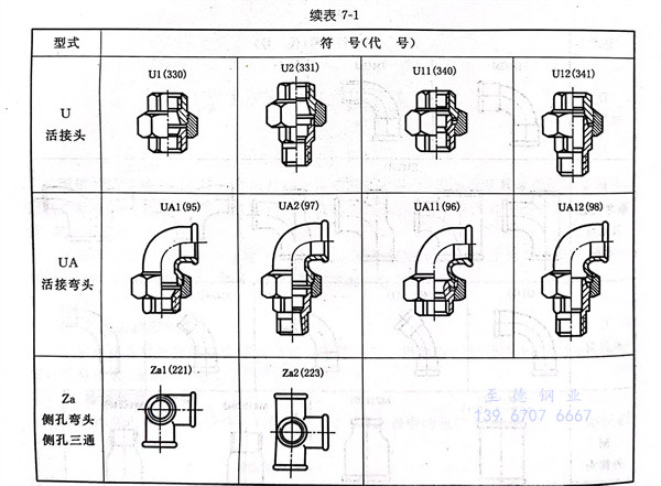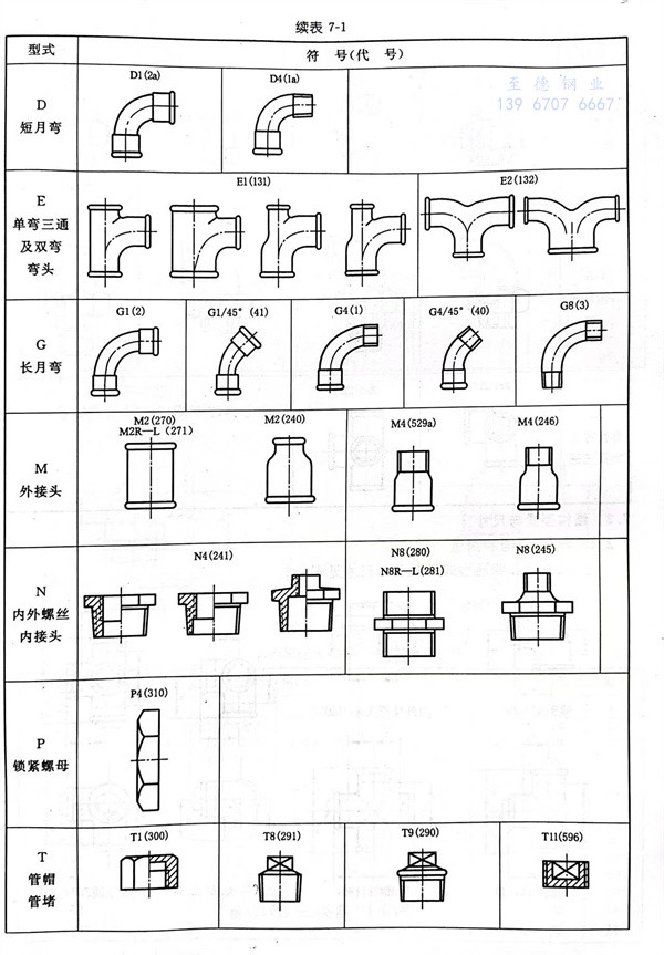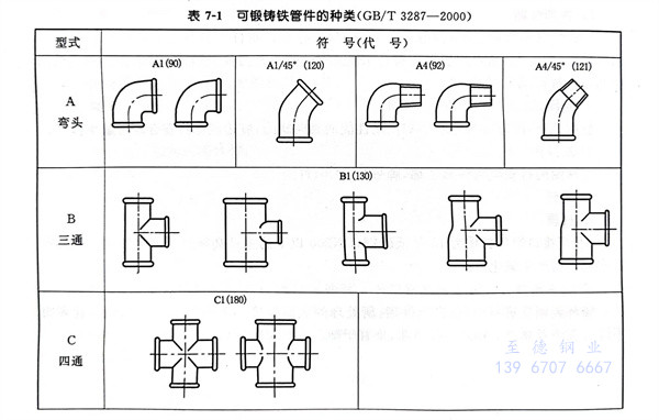 按結構型式(shi)劃分的可鍛(duan)鑄鐵(tie)管(guan)件種類見表7-1。表中的規定符(fu)號(代號)與管(guan)路識別有關,可以用(yong)于標記。