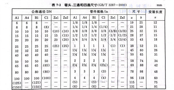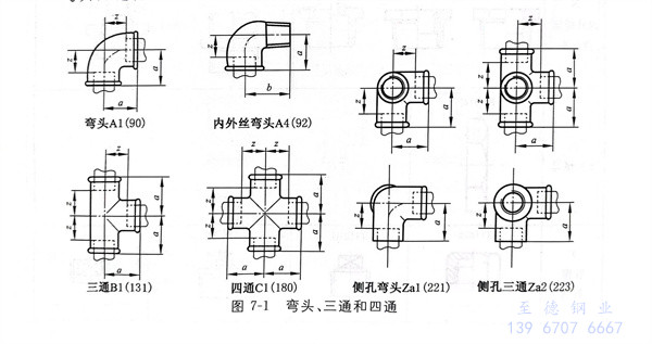 彎(wan)頭、三(san)通和(he)四通型式見圖 7-1 ,尺寸見表 7-2 。