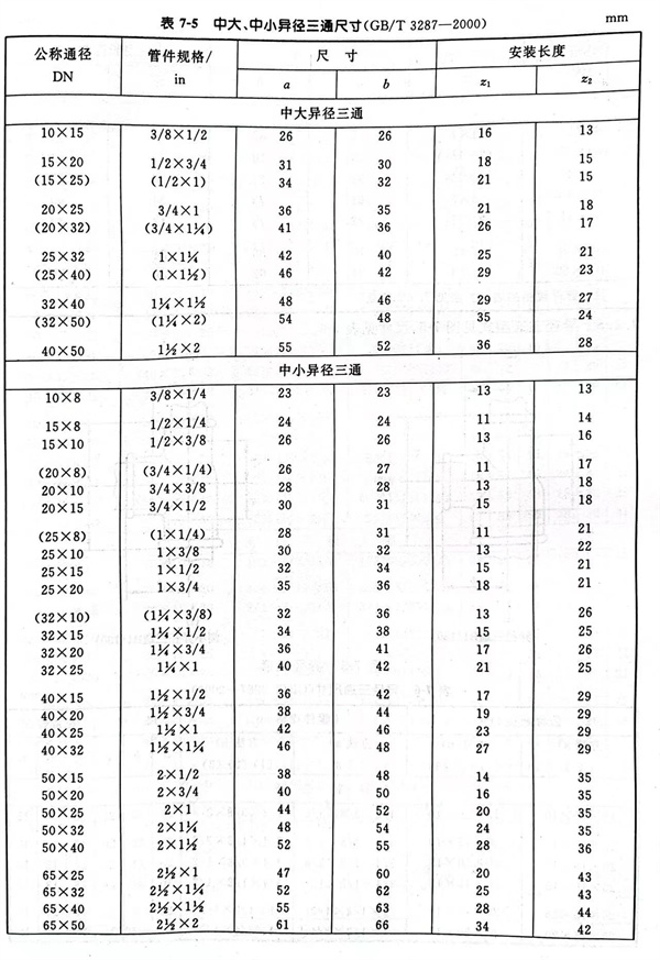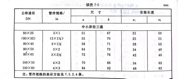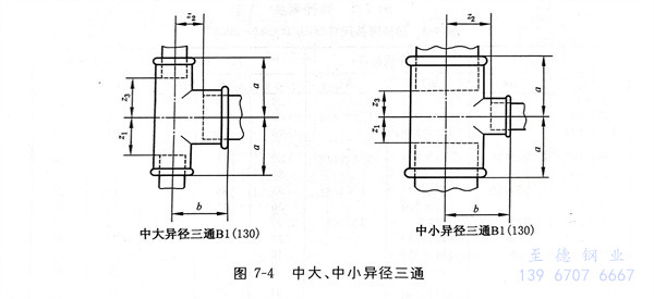 中(zhong)大、中(zhong)小(xiao)異徑三通型式見圖 7-4 ,尺寸見表 7-5 。