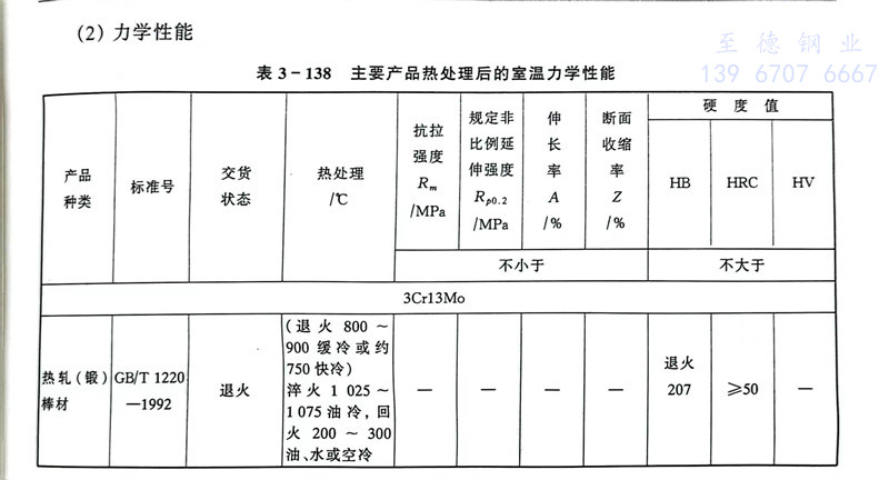 主要性能與3Cr13不(bu)銹鋼(gang)相同。但因含有0.50%~1.00%鉬,可提高鋼的耐蝕性,其耐蝕性比3Cr13不銹鋼和4Cr13不銹(xiu)鋼好。3Cr13Mo不銹鋼經淬火并回火熱處理后,在腐蝕介質中具有承受高機械載荷能力和耐磨性能。但可焊性能差。