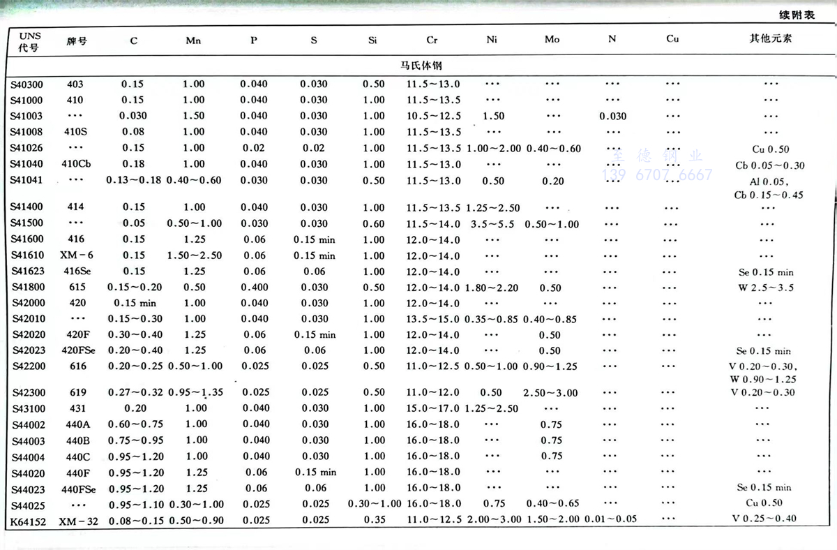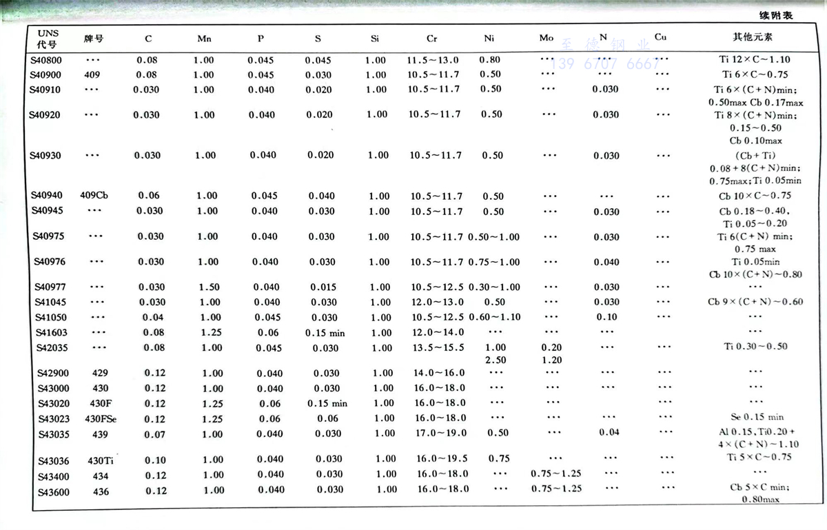 美國材料與試驗協會(ASTM)不銹鋼標準牌號及化學成分(%)
