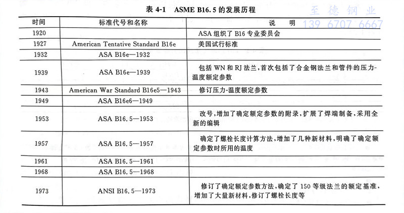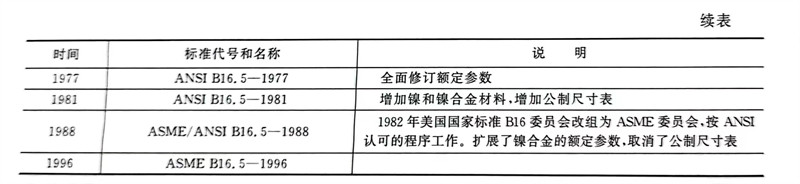 美國ASMEB16.5《管法蘭和法蘭管件》是一套在世界上通用的、系統性較強、內容涉及墊片、螺栓及管子的完整的管法蘭(lan)標準(表4-1)。其公稱直徑為NPS1/2~24,其適用的不銹鋼管外徑尺寸應符合 ASME B36.10M。該標準從1927年經美國標準協會(ASA)批準為美國試行標準B16e以來,已經先后進行了十多次修訂。1981年增加了公制尺寸,稱為ANSIB16.5,但在1988年版中取消了公制尺寸,稱為ASME/ANSI B16.5,1996年開始稱為ASME B16.5,一直沿用到現在的最新版本。
