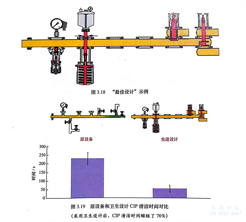 然后,他將原(yuan)設(she)備設(she)計與“最(zui)(zui)佳設(she)計”進行(xing)了比較。最(zui)(zui)佳設(she)計采用了衛(wei)生設(she)計的(de)(de)原(yuan)則采用無縫隙接頭,采用平滑的(de)(de)彎管,最(zui)(zui)大(da)程度(du)減少死角等(圖(tu)3.18)。最(zui)(zui)先進的(de)(de)設(she)計可以提高清潔效(xiao)率。