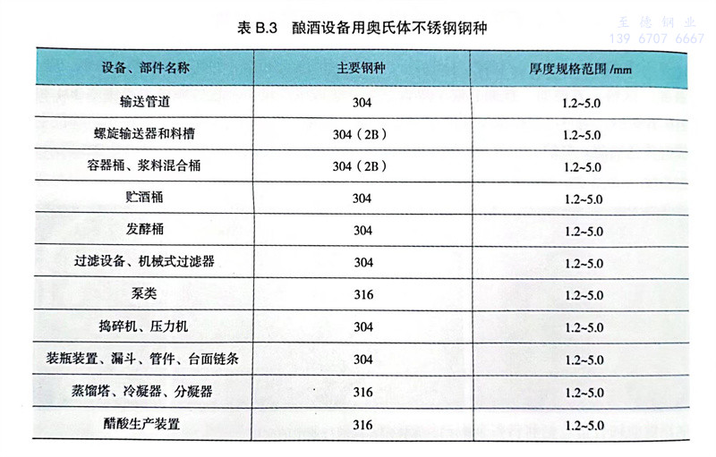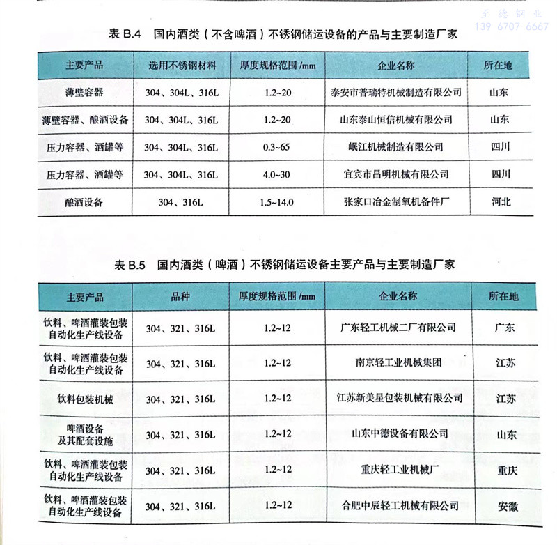 葡萄(tao)酒(jiu)(jiu)等生產設備(bei)也大量使用(yong)304和316不(bu)銹鋼(gang)(gang),其(qi)中(zhong)304不(bu)銹鋼(gang)(gang)主要(yao)用(yong)于容器桶、料槽、貯酒(jiu)(jiu)桶、發酵桶、過濾設備(bei)、搗(dao)碎機(ji)、壓力機(ji)、管件等;316不(bu)銹鋼(gang)(gang)主要(yao)用(yong)于蒸餾塔、冷(leng)凝(ning)器、分(fen)凝(ning)器、酒(jiu)(jiu)醋生產裝置,釀酒(jiu)(jiu)設備(bei)或配件用(yong)不(bu)銹鋼(gang)(gang)鋼(gang)(gang)種、主要(yao)產品(pin)與生產企(qi)業(ye)如表(biao)B.3~表(biao)B.5所示。