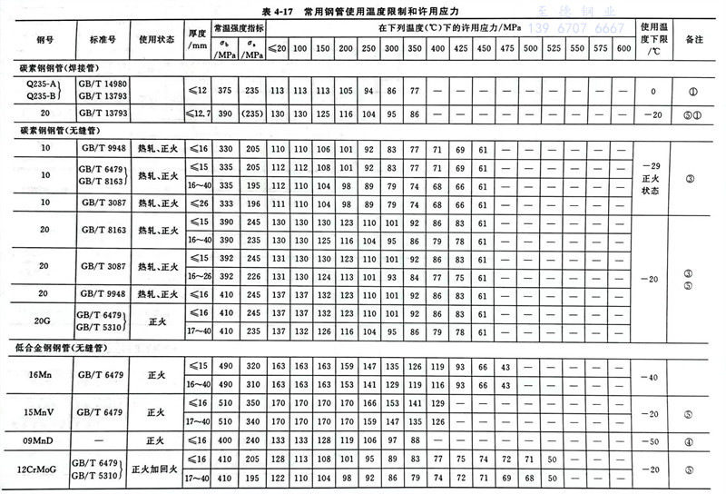 常(chang)用(yong)鋼管使用(yong)溫度限制(zhi)和許用(yong)應(ying)力見表4-17。
