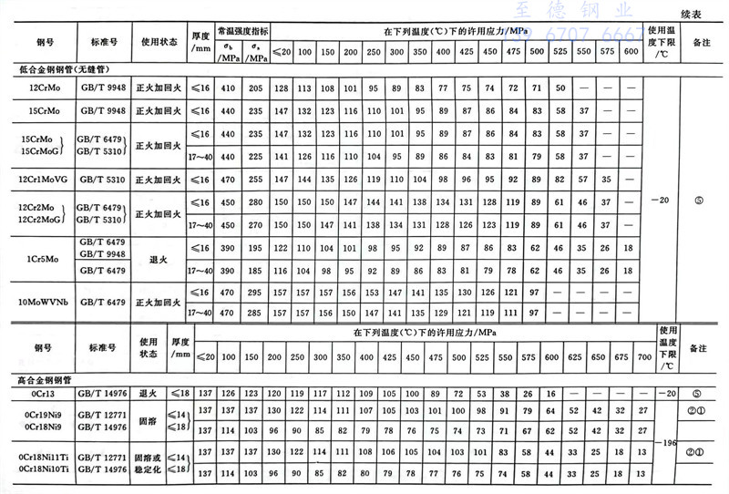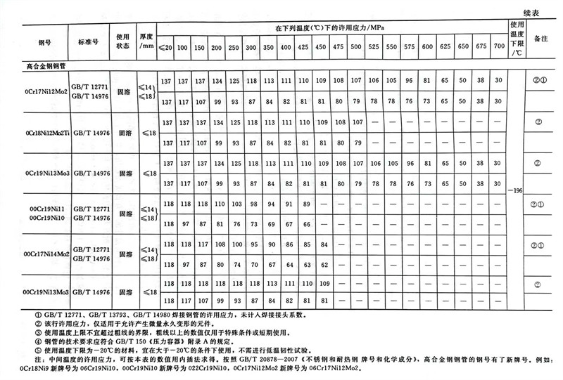 注:中間溫度的許用應力,可按本表的數值用內插法求得。按照GB/T 20878-2007《不銹鋼和耐熱鋼 牌號和化學成分》,高合金鋼鋼管的鋼號有了新牌號。例如:0Cr18Ni9 新牌號為06Cr19Ni10,00Cr19Ni10 新牌號為022Cr19Ni10,0Cr17Ni12Mo2 新牌號為 06Cr17Ni12Mo2。