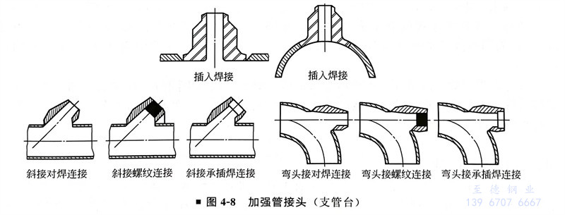 圖(tu)4-8所示的(de)插(cha)入(ru)加(jia)(jia)強管接(jie)(jie)頭(tou)(tou)、斜(xie)接(jie)(jie)加(jia)(jia)強管接(jie)(jie)頭(tou)(tou)、彎頭(tou)(tou)加(jia)(jia)強管接(jie)(jie)頭(tou)(tou)以及Sweepolet加(jia)(jia)強管接(jie)(jie)頭(tou)(tou)與主管連接(jie)(jie)的(de)焊縫(feng)可進行(xing)無損探(tan)傷檢查,焊接(jie)(jie)可靠,克服了“馬鞍焊”的(de)角焊縫(feng)質(zhi)量不宜保證、檢查困難(nan)的(de)缺點,適用于火災危(wei)險分類為甲、乙類介(jie)質(zhi)和劇毒介(jie)質(zhi)的(de)管道(dao),是(shi)理想的(de)管接(jie)(jie)頭(tou)(tou)。目前,國(guo)內還沒有制造廠生產這幾種接(jie)(jie)頭(tou)(tou)。圖(tu)4-9所示是(shi)承插(cha)焊與螺紋連接(jie)(jie)的(de)變徑(jing)管接(jie)(jie)頭(tou)(tou),用于DN50以下管道(dao)及其管配件的(de)連接(jie)(jie)。