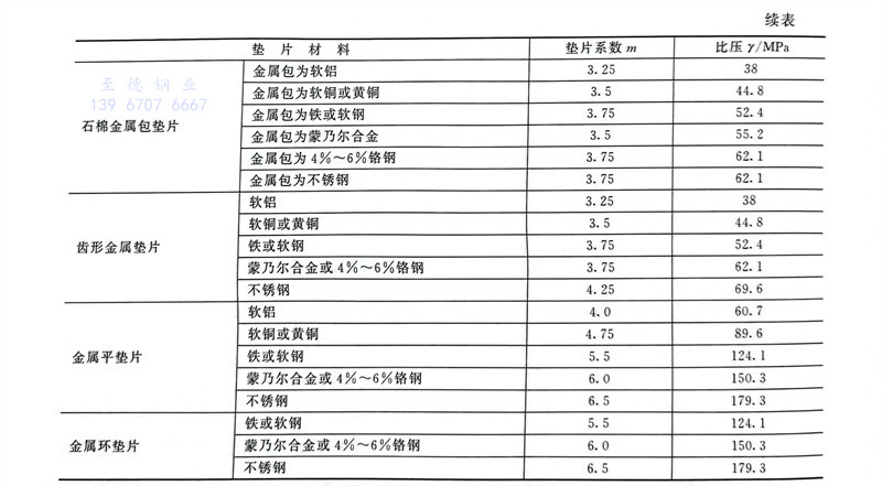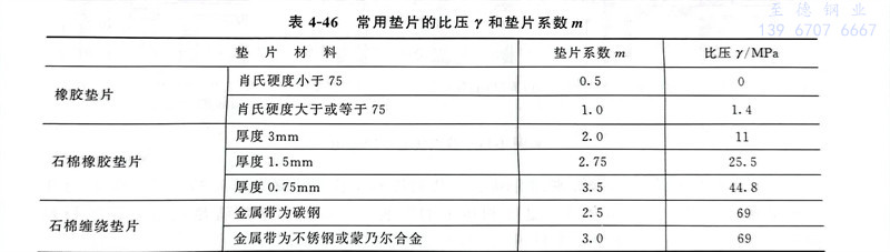 非金(jin)屬(shu)和(he)(he)半金(jin)屬(shu)墊(dian)(dian)(dian)片(pian)(pian)的(de)應力(li)松弛率按《管(guan)法蘭墊(dian)(dian)(dian)片(pian)(pian)應力(li)松弛試(shi)(shi)驗(yan)方(fang)法》(GB/T 12621)測得。這兩類(lei)墊(dian)(dian)(dian)片(pian)(pian)的(de)壓縮率和(he)(he)回彈率按《管(guan)法蘭墊(dian)(dian)(dian)片(pian)(pian)壓縮率及回彈率試(shi)(shi)驗(yan)方(fang)法》(GB/T12622)測定(ding)。此(ci)外,國標還(huan)規定(ding)了纏繞墊(dian)(dian)(dian)的(de)試(shi)(shi)驗(yan)方(fang)法,見GB/T 14180。常用墊(dian)(dian)(dian)片(pian)(pian)的(de)比壓γ和(he)(he)墊(dian)(dian)(dian)片(pian)(pian)系數(shu)m見表4-46。