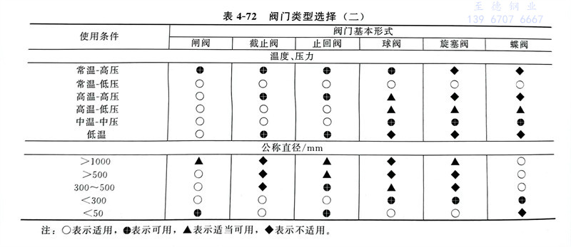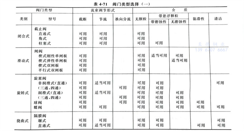 表4-71與(yu)表4-72所(suo)列可作為閥門類(lei)型選擇的(de)參考。各種閥門的(de)使用范圍(wei)、材質及結構尺(chi)寸等見有關(guan)制造廠的(de)產品說明書及樣本。
