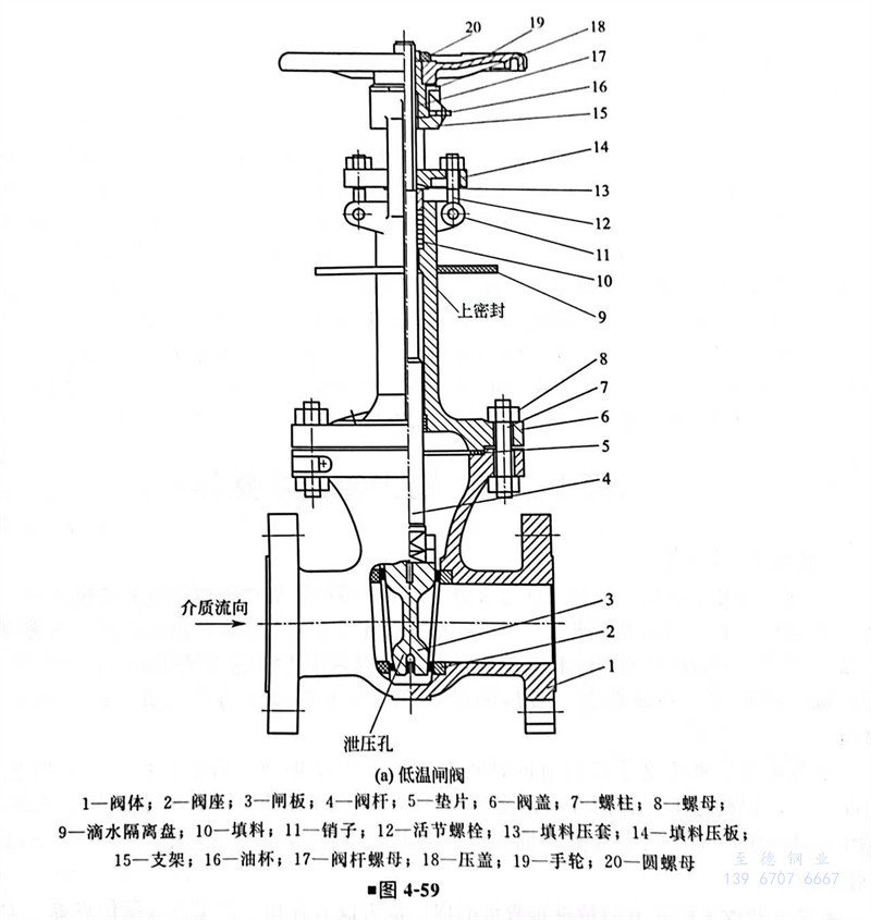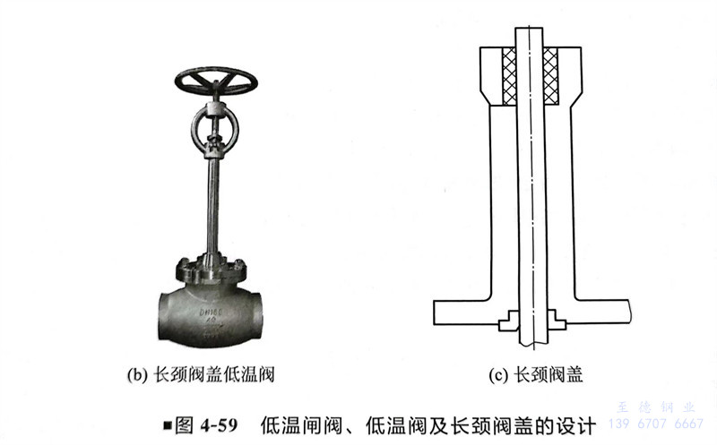 奧氏體不(bu)銹耐酸鋼制造,經熱處(chu)(chu)理,以提(ti)高抗(kang)拉強度,鍍(du)硬鉻(鍍(du)層厚度0.04~0.06mm),或(huo)進行滲氮處(chu)(chu)理,以提(ti)高表面硬度。介質溫度的(de)降低容(rong)易在填料(liao)函處(chu)(chu)產生泄漏(lou)和結(jie)冰,閥門閥蓋長頸結(jie)構(gou),填料(liao)避開低溫區,提(ti)高填料(liao)的(de)使(shi)用(yong)性能和使(shi)用(yong)壽(shou)命(ming),見圖4-59。