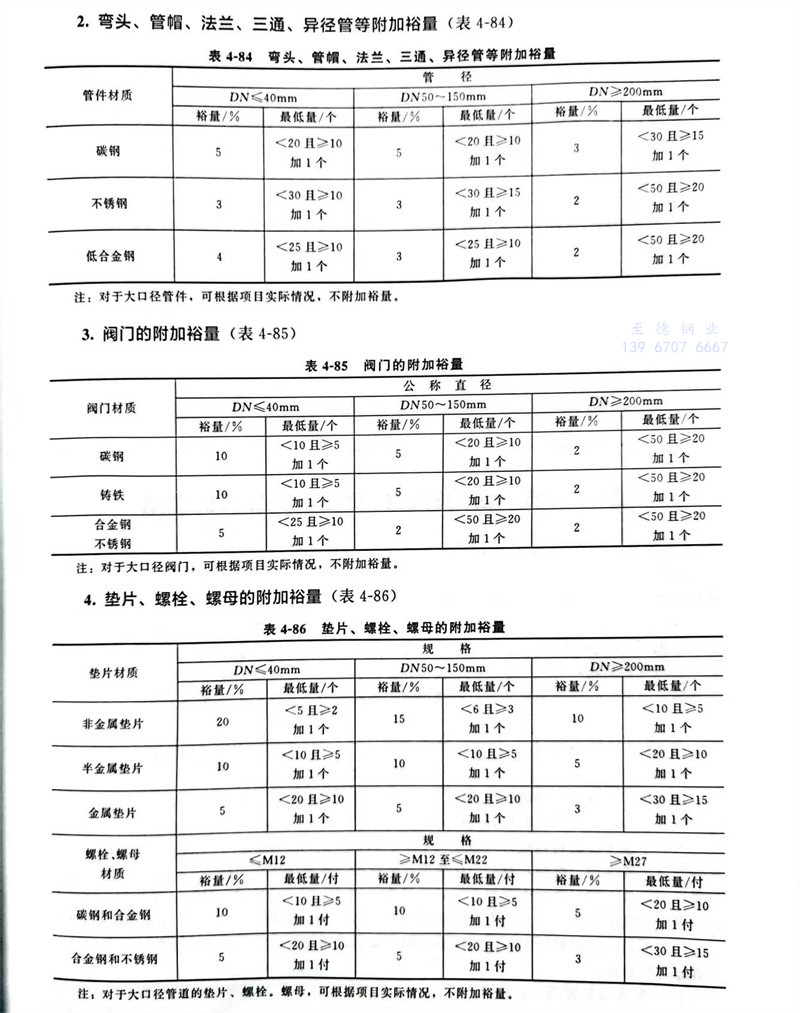 ①. 對于尺寸小、數量(liang)大的(de)管道材料,應考慮較多的(de)裕量(liang)。