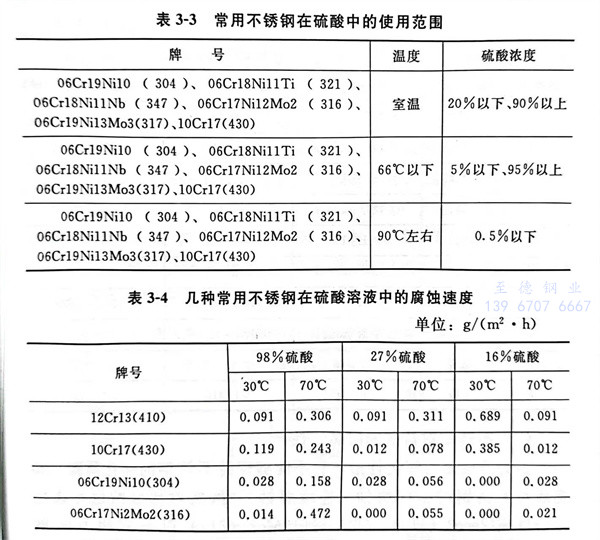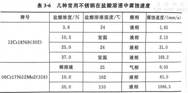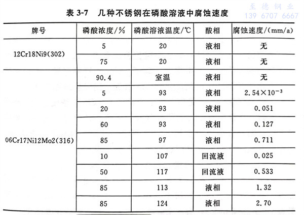 一般說來,不含Mo的不銹鋼,不能用于耐硫酸腐蝕;而含Mo:2%~3%的06Cr17Ni12Mo2、022Cr17Ni14Mo2、06Cr18Ni12Mo2Ti等,是可供選用的耐硫酸的最低牌號;同樣含Mo:2%~3%的一些雙相不銹鋼,例如,00Cr25N6NiMo2N等的耐硫酸性能相當或優于含Mo:2%~3%的Cr-Ni奧氏體鋼。高Mo(含Mo≥4%)不銹鋼的耐硫酸性能又比一般含Mo:2%~3%的鋼進一步提高。但是,當鋼中既含Mo又含Cu時,其耐硫酸性能又優于僅含Mo的不銹鋼,因而,它們的使用范圍可較僅含Mo的鋼更加擴大。而用Mo、Cu、Si(3%~4%)三元素復合金化的Cr-Ni奧氏體鋼和雙相不銹鋼則是耐硫酸不銹鋼中性能更佳,使用范圍更寬的一類。截至目前為止,高牌號耐硫酸不銹鋼,例如,0Cr23Ni28Mo3Cu3Ti、1Cr24M20Mo2Cu3、0Cr20Ni29Mo3Cu4等主要用于常壓下耐80℃以下的各種濃度硫酸。但是在90%~98%的高溫濃硫酸中,根據使用溫度和濃度,只有選用高Si:6%不銹鋼才能取得滿意的結果。幾種常用不銹鋼在不同濃度、溫度的硫酸中的腐蝕速度,見表3-4。幾種常用不銹鋼在鹽酸溶液中腐蝕速度,見表3-6。幾種常用不銹鋼在磷酸溶液中腐蝕速度,見表3-7。