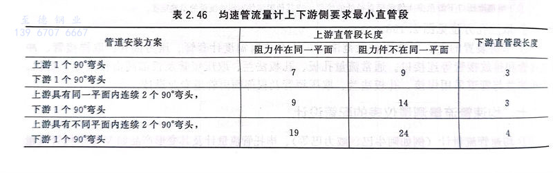 ⑤. 測量精度(du)要(yao)求為(wei)(wei)±1%時(shi),均速(su)管(guan)流量計上、下游側(ce)直(zhi)管(guan)段長度(du)應符(fu)合表2.46的要(yao)求。測量精度(du)要(yao)求為(wei)(wei)士3%時(shi),至少應有上游側(ce)3DN、下游側(ce)2DN的直(zhi)管(guan)段長度(du)。