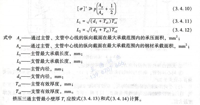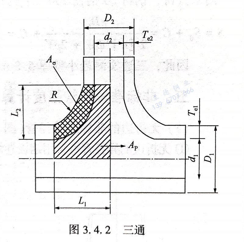 擠壓不銹鋼三(san)(san)通(tong)(tong)的(de)(de)壁厚計(ji)(ji)算應(ying)采用(yong)壓力面積法,計(ji)(ji)算時,應(ying)控制三(san)(san)通(tong)(tong)承載(zai)截面上的(de)(de)一次應(ying)力不超(chao)過(guo)材料(liao)在(zai)工作(zuo)溫度下的(de)(de)許用(yong)應(ying)力,許用(yong)應(ying)力應(ying)按式(shi)(3.4.10)計(ji)(ji)算。承受內壓的(de)(de)三(san)(san)通(tong)(tong)外(wai)形見圖3.4.2承載(zai)區的(de)(de)尺寸應(ying)按式(shi)(3.4.11)和式(shi)(3.4.12)計(ji)(ji)算。