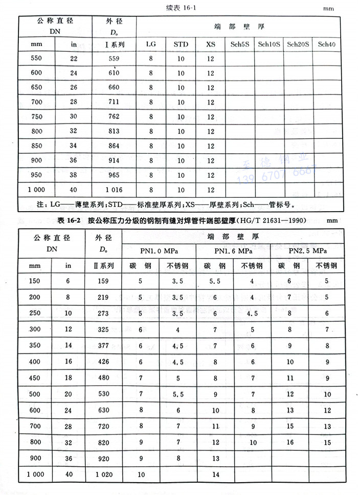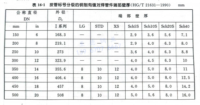 按(an)管標(biao)號分級的鋼(gang)制有縫對焊管件端部(bu)壁厚見表16-1。