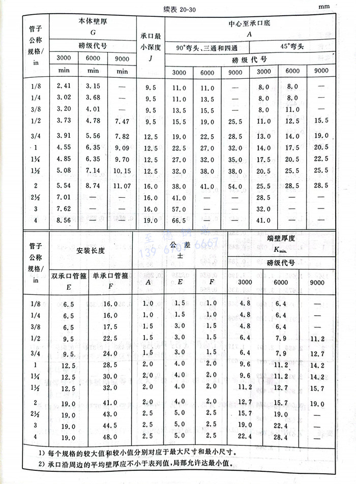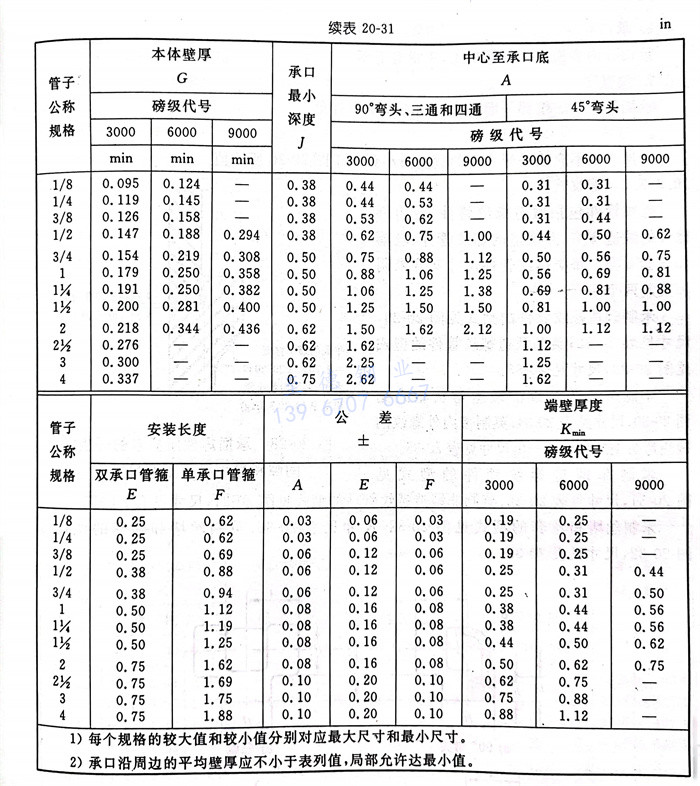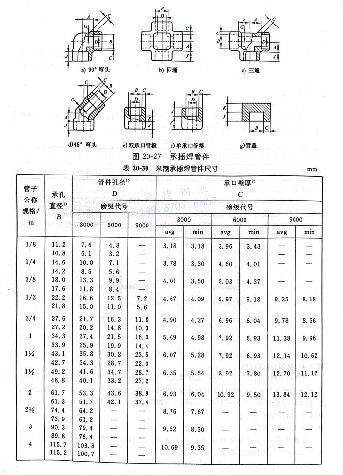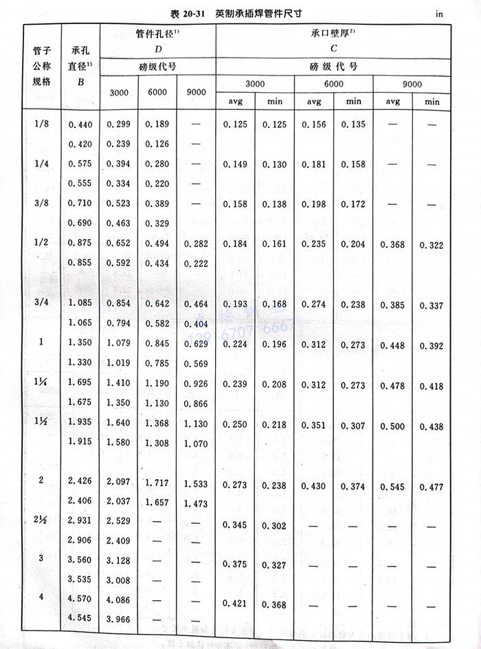 承(cheng)插焊(han)管件本體(ti)壁(bi)厚應等于或大于表20-30和20-31中所示的G值。