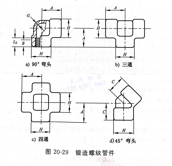 米制(zhi)鍛造螺紋(wen)管件(jian)的型(xing)式(shi)(shi)見圖(tu)20-29,尺寸見表20-32;英制(zhi)鍛造螺紋(wen)管件(jian)的型(xing)式(shi)(shi)見圖(tu)20-29,尺寸見20-33。