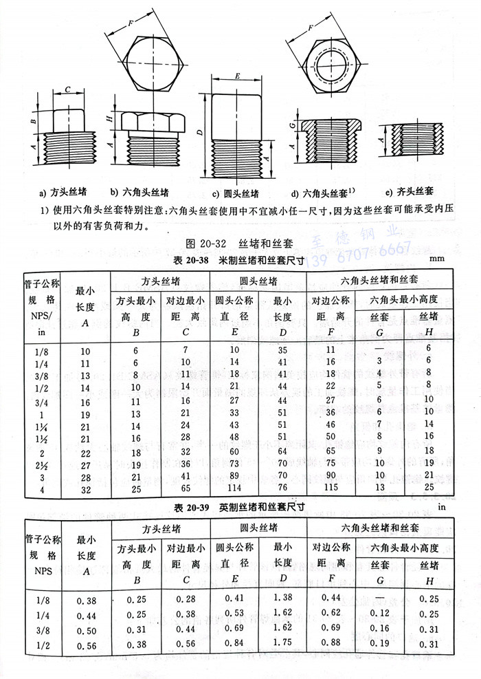 米制絲堵和絲套的型式(shi)見(jian)(jian)圖20-32,尺寸見(jian)(jian)表(biao)20-38;英制絲堵和絲套的型式(shi)見(jian)(jian)圖20-32,尺寸見(jian)(jian)表(biao)20-39。
