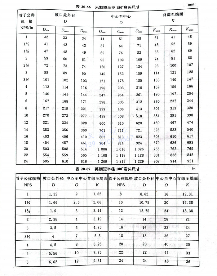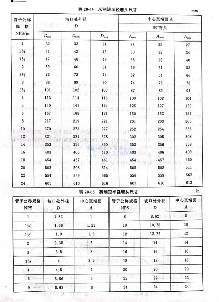 表(biao)20-64~表(biao)20-69中管件的規格采用ANSI/ASME B36.10《焊(han)接和無縫軋(ya)制鋼管》定義的管子公稱規格(NPS)表(biao)示。