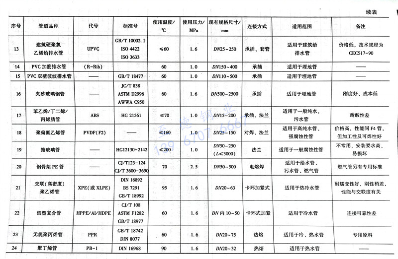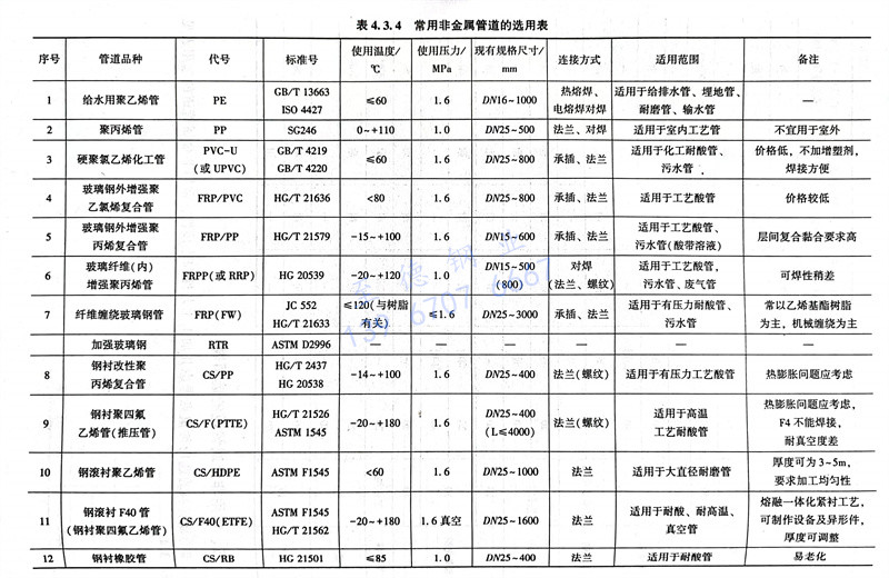 非金屬材料的(de)選(xuan)用須重點考慮(lv)其加工工藝性(xing)和連接性(xing),常(chang)用非金屬管道的(de)選(xuan)用表見表4.3.4。