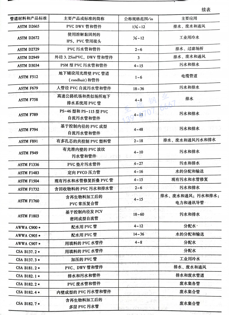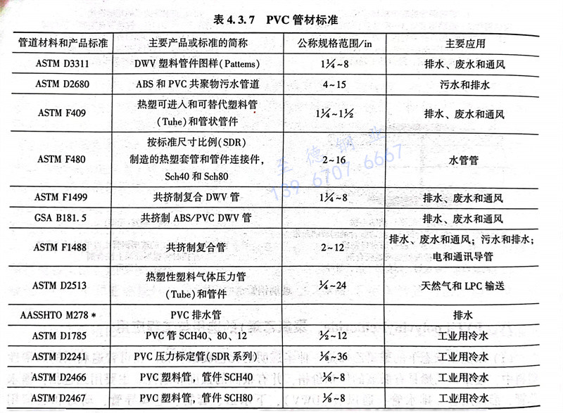 (4)PVC管(guan)(guan)材規(gui)格(ge)已經標準化,如表4.3.7所示。PVC管(guan)(guan)適(shi)用(yong)溫(wen)度(du)(du)范圍為-15~60℃,下限溫(wen)度(du)(du)使(shi)用(yong)時(shi)容易開(kai)裂,高于(yu)上限溫(wen)度(du)(du)使(shi)用(yong)時(shi)軟化。PVC管(guan)(guan)一般(ban)分為輕型管(guan)(guan)和重型管(guan)(guan)兩種。硬聚(ju)氯(lv)乙烯(xi)管(guan)(guan)可(ke)用(yong)于(yu)真(zhen)空(kong)度(du)(du)<740mmHg的(de)管(guan)(guan)道。常(chang)溫(wen)下,硬聚(ju)氯(lv)乙烯(xi)管(guan)(guan)的(de)使(shi)用(yong)壓(ya)力如下:輕型管(guan)(guan)≤0.6MPa;重型管(guan)(guan)≤1.0MPa。