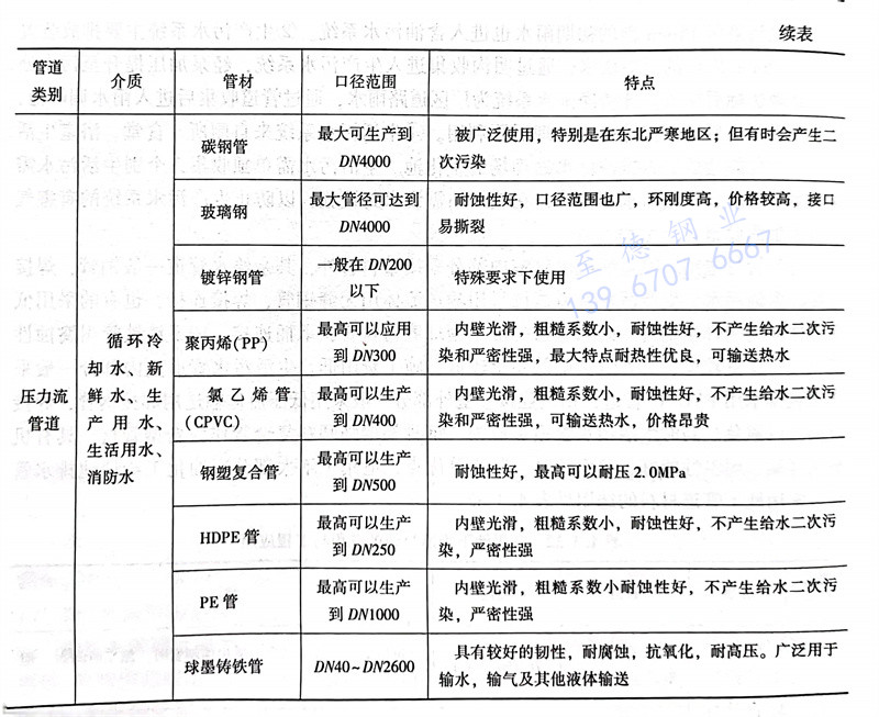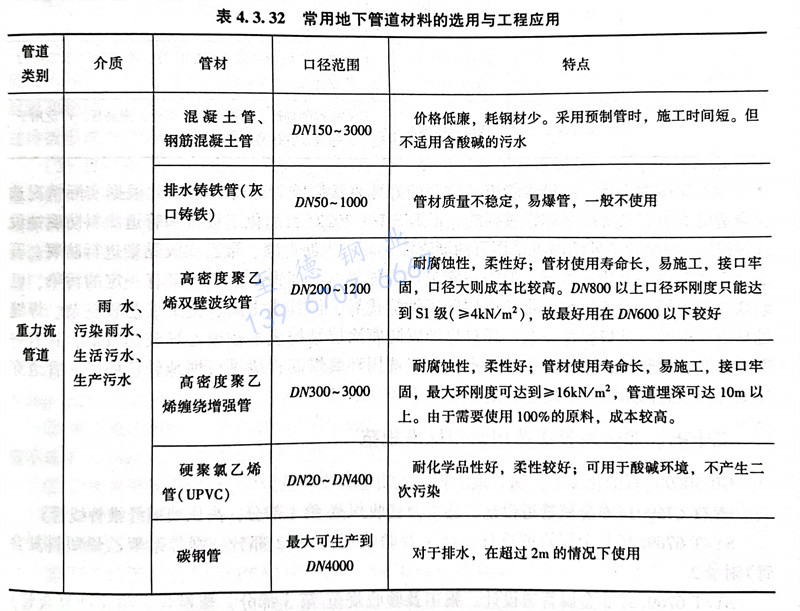 除生(sheng)活給(gei)水(shui)(shui)(shui)管(guan)(guan)(guan)室(shi)內(nei)部(bu)分(fen)采用(yong)(yong)(yong)(yong)塑(su)料管(guan)(guan)(guan)外(wai)(wai),其余(yu)給(gei)水(shui)(shui)(shui)管(guan)(guan)(guan)道(dao)一般(ban)(ban)鋼(gang)管(guan)(guan)(guan),焊(han)接(jie)(jie)(jie)(jie)連(lian)接(jie)(jie)(jie)(jie)。含油(you)污(wu)水(shui)(shui)(shui)、生(sheng)產污(wu)水(shui)(shui)(shui)管(guan)(guan)(guan)道(dao)建議(yi)采用(yong)(yong)(yong)(yong)輸送(song)(song)流(liu)體用(yong)(yong)(yong)(yong)無(wu)縫(feng)鋼(gang)管(guan)(guan)(guan),焊(han)接(jie)(jie)(jie)(jie)連(lian)接(jie)(jie)(jie)(jie),也有的采用(yong)(yong)(yong)(yong)低(di)(di)壓流(liu)體輸送(song)(song)用(yong)(yong)(yong)(yong)焊(han)接(jie)(jie)(jie)(jie)鋼(gang)管(guan)(guan)(guan)。雨水(shui)(shui)(shui)管(guan)(guan)(guan)道(dao)一般(ban)(ban)采用(yong)(yong)(yong)(yong)球磨(mo)鑄鐵管(guan)(guan)(guan),承插(cha)連(lian)接(jie)(jie)(jie)(jie)。球墨(mo)鑄鐵管(guan)(guan)(guan)耐(nai)腐蝕性能較強、管(guan)(guan)(guan)壁較厚、對管(guan)(guan)(guan)道(dao)基礎(chu)的要求較低(di)(di)、施工費用(yong)(yong)(yong)(yong)低(di)(di)。生(sheng)活污(wu)水(shui)(shui)(shui)管(guan)(guan)(guan)道(dao)室(shi)內(nei)部(bu)分(fen)一般(ban)(ban)采用(yong)(yong)(yong)(yong)建筑排水(shui)(shui)(shui)用(yong)(yong)(yong)(yong)PVC-U管(guan)(guan)(guan)道(dao),粘(zhan)接(jie)(jie)(jie)(jie)連(lian)接(jie)(jie)(jie)(jie);室(shi)外(wai)(wai)部(bu)分(fen)一般(ban)(ban)采用(yong)(yong)(yong)(yong)低(di)(di)壓流(liu)體輸送(song)(song)用(yong)(yong)(yong)(yong)焊(han)接(jie)(jie)(jie)(jie)鋼(gang)管(guan)(guan)(guan),焊(han)接(jie)(jie)(jie)(jie)連(lian)接(jie)(jie)(jie)(jie),以避免過路(lu)時生(sheng)活污(wu)水(shui)(shui)(shui)管(guan)(guan)(guan)道(dao)被壓損。鋼(gang)骨架增強塑(su)料復合管(guan)(guan)(guan)作(zuo)為新型管(guan)(guan)(guan)材(cai),具有機械(xie)強度(du)高、耐(nai)溫性能好、雙面防腐、節能等優(you)點,適用(yong)(yong)(yong)(yong)于絕(jue)大部(bu)分(fen)石(shi)油(you)化工給(gei)埋地排水(shui)(shui)(shui)管(guan)(guan)(guan)道(dao)。常用(yong)(yong)(yong)(yong)地下(xia)管(guan)(guan)(guan)道(dao)材(cai)料的選用(yong)(yong)(yong)(yong)見表4.3.32。