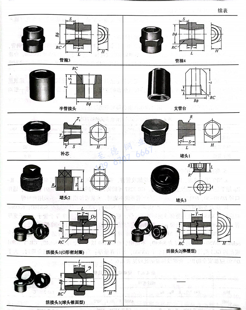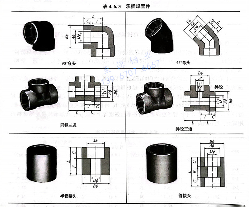 ①. 如表(biao)4.6.3中圖所示。通(tong)常情況(kuang)下,承插焊管(guan)件用(yong)于DN≤40mmm、管(guan)壁較(jiao)薄的(de)管(guan)子(zi)和管(guan)件之間(jian)的(de)連接。包括彎頭、三通(tong)、加(jia)強(qiang)(qiang)管(guan)口、加(jia)強(qiang)(qiang)管(guan)接頭、管(guan)帽、管(guan)箍、異徑(jing)短節、活接頭、絲堵、儀(yi)表(biao)管(guan)口、軟管(guan)站快速接頭、水(shui)噴頭等(deng)。