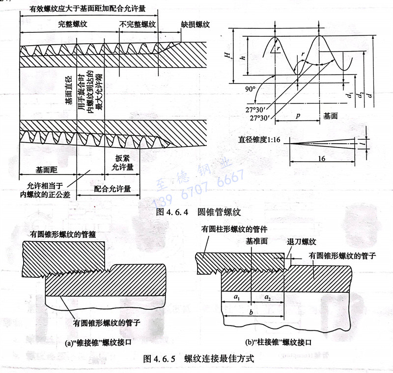 ①. 常(chang)用材(cai)料有(you)鍛鋼、鑄(zhu)鋼、鑄(zhu)鐵、可鍛鑄(zhu)鐵,石油化(hua)工裝置的(de)(de)工藝管(guan)(guan)(guan)(guan)道大多選(xuan)用鍛鋼制(zhi)(zhi)錐(zhui)管(guan)(guan)(guan)(guan)螺(luo)(luo)紋(wen)(wen)(wen)管(guan)(guan)(guan)(guan)件(jian)(jian)(jian)。常(chang)用鍛鋼制(zhi)(zhi)螺(luo)(luo)紋(wen)(wen)(wen)管(guan)(guan)(guan)(guan)件(jian)(jian)(jian)的(de)(de)標準(zhun)有(you)HG/T 21632、GB/T 14626、GB/T 19326、ASMEB16.1、GB/T 3287、MSS SP83《活接(jie)(jie)(jie)(jie)頭》、MSSSP97《支管(guan)(guan)(guan)(guan)臺》、MSS SP95《異徑(jing)短管(guan)(guan)(guan)(guan)及管(guan)(guan)(guan)(guan)堵》、GB/T 8464《水暖內螺(luo)(luo)紋(wen)(wen)(wen)》、API 602《小口徑(jing)閘閥》。螺(luo)(luo)紋(wen)(wen)(wen)連(lian)接(jie)(jie)(jie)(jie)也多用于(yu)DN≤40的(de)(de)管(guan)(guan)(guan)(guan)子及其元件(jian)(jian)(jian)之間的(de)(de)連(lian)接(jie)(jie)(jie)(jie)。常(chang)用于(yu)不宜焊接(jie)(jie)(jie)(jie)或需要可拆(chai)卸的(de)(de)場合。螺(luo)(luo)紋(wen)(wen)(wen)連(lian)接(jie)(jie)(jie)(jie)件(jian)(jian)(jian)有(you)陽螺(luo)(luo)紋(wen)(wen)(wen)(male screw)和陰螺(luo)(luo)紋(wen)(wen)(wen)(femalescrew)之分。管(guan)(guan)(guan)(guan)螺(luo)(luo)紋(wen)(wen)(wen)分圓錐(zhui)管(guan)(guan)(guan)(guan)螺(luo)(luo)紋(wen)(wen)(wen)和圓柱管(guan)(guan)(guan)(guan)螺(luo)(luo)紋(wen)(wen)(wen)兩種,管(guan)(guan)(guan)(guan)螺(luo)(luo)紋(wen)(wen)(wen)如(ru)圖(tu)4.6.3、圖(tu)4.6.4所示,在(zai)管(guan)(guan)(guan)(guan)連(lian)接(jie)(jie)(jie)(jie)中(zhong)常(chang)被(bei)采用。如(ru)一般把(ba)管(guan)(guan)(guan)(guan)件(jian)(jian)(jian)、設備加(jia)工成圓柱形內螺(luo)(luo)紋(wen)(wen)(wen),把(ba)管(guan)(guan)(guan)(guan)子加(jia)工成圓錐(zhui)形外(wai)螺(luo)(luo)紋(wen)(wen)(wen),除安裝方便(bian)外(wai)且密封性能好,可鍛鑄(zhu)鐵管(guan)(guan)(guan)(guan)件(jian)(jian)(jian)大都采用錐(zhui)形內螺(luo)(luo)紋(wen)(wen)(wen),它(ta)與管(guan)(guan)(guan)(guan)子圓錐(zhui)形外(wai)螺(luo)(luo)紋(wen)(wen)(wen)連(lian)接(jie)(jie)(jie)(jie),效果極佳。管(guan)(guan)(guan)(guan)連(lian)接(jie)(jie)(jie)(jie)中(zhong)的(de)(de)“錐(zhui)接(jie)(jie)(jie)(jie)錐(zhui)”螺(luo)(luo)紋(wen)(wen)(wen)接(jie)(jie)(jie)(jie)口和“柱接(jie)(jie)(jie)(jie)錐(zhui)”螺(luo)(luo)紋(wen)(wen)(wen)接(jie)(jie)(jie)(jie)口如(ru)圖(tu)4.6.5所示。