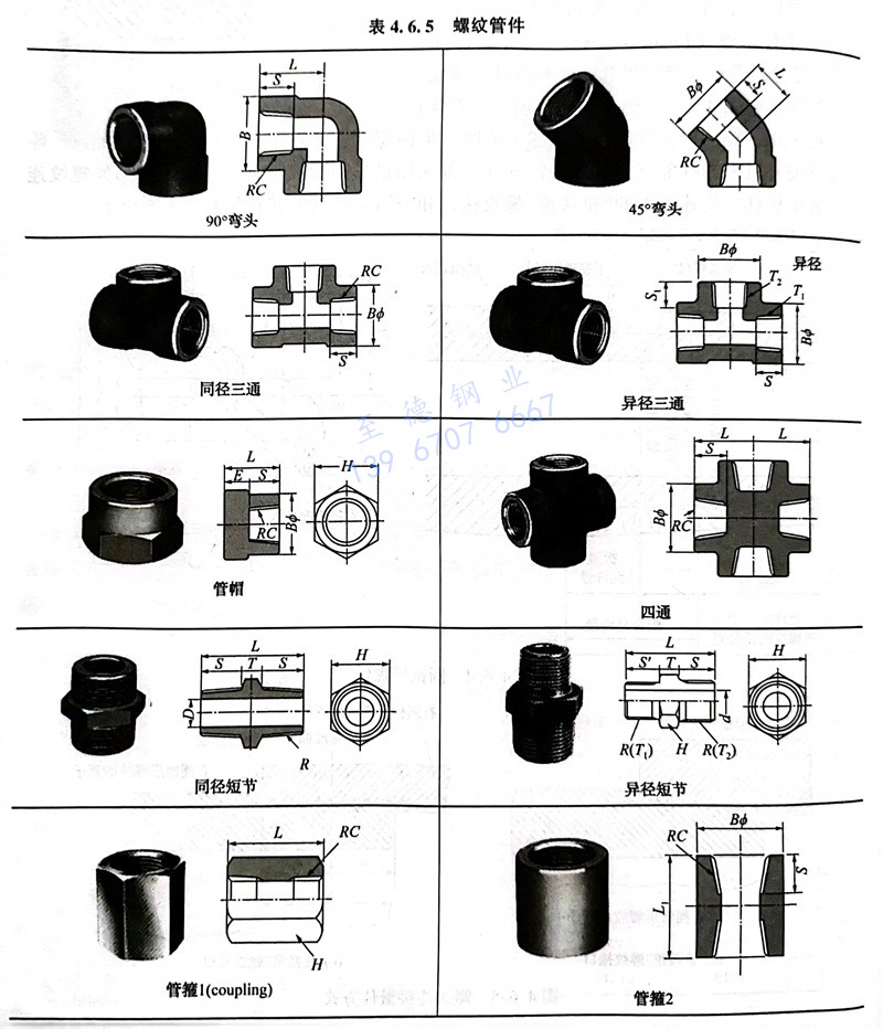 ③. 常用的不銹鋼(gang)管件中,螺(luo)(luo)紋(wen)(wen)短節為(wei)陽螺(luo)(luo)紋(wen)(wen),而彎頭(tou)、三通、管帽、活接頭(tou)等多為(wei)陰螺(luo)(luo)紋(wen)(wen),使用時應注意它們之(zhi)間(jian)的搭配(pei)和(he)組合。螺(luo)(luo)紋(wen)(wen)管件見表4.6.5。