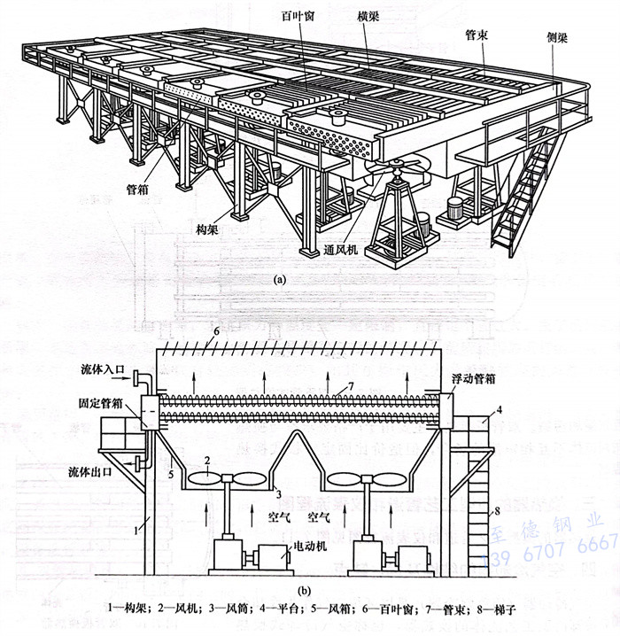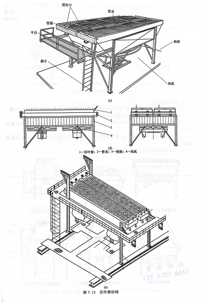 空氣冷卻器主要由管(guan)束、通(tong)風機、構(gou)架(jia)及百葉窗等組(zu)成,如圖7.12所示。