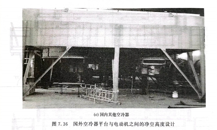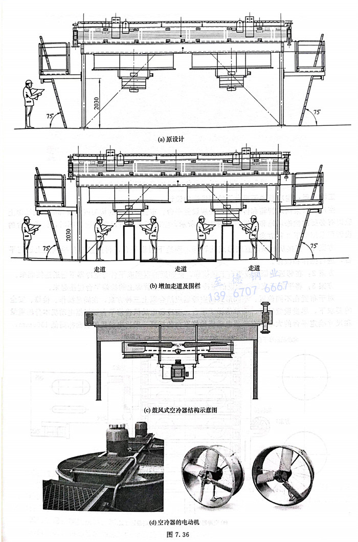浙江至德(de)鋼業(ye)(ye)有限(xian)公司(si)在進行(xing)(xing)某空(kong)冷器(qi)設(she)計評審(shen)時,業(ye)(ye)主按照他們(men)國家的(de)(de)規(gui)范要求:空(kong)冷器(qi)下方“walking/working surfaces(行(xing)(xing)走/工作面)”區域凈空(kong)高(gao)度至少(shao)為2030mm。而設(she)計的(de)(de)實際空(kong)冷器(qi)高(gao)度,如圖(tu)(tu)(tu)7.36(a)所示,電(dian)動機下方沒有滿(man)足這(zhe)個高(gao)度要求,如果修改空(kong)冷器(qi)支腿高(gao)度,則對(dui)項目影響(xiang)很(hen)大。后來,在空(kong)冷器(qi)下增加(jia)了走道和欄(lan)桿,如圖(tu)(tu)(tu)7.36(b)所示,滿(man)足了當地(di)的(de)(de)規(gui)范要求。圖(tu)(tu)(tu)7.36(c)~(e)為有關設(she)計參考圖(tu)(tu)(tu)。