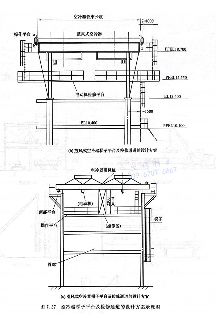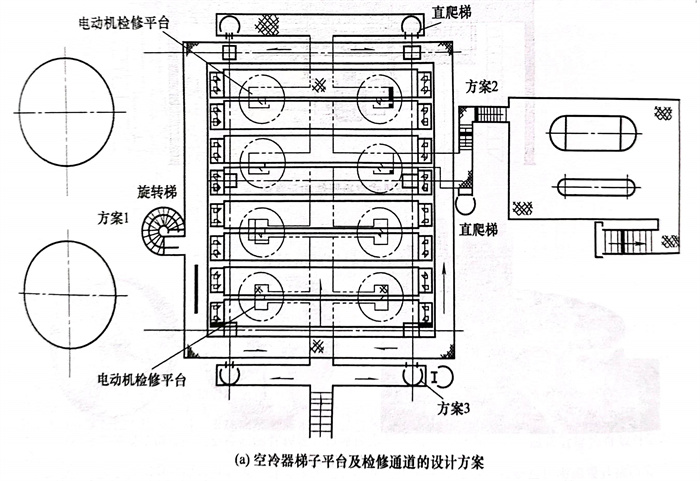 空(kong)冷器(qi)管(guan)(guan)束兩端管(guan)(guan)箱和(he)傳(chuan)動(dong)機械處應(ying)設(she)置(zhi)(zhi)平臺。布置(zhi)(zhi)空(kong)冷器(qi)的(de)構架(jia)或主(zhu)管(guan)(guan)廊(lang)的(de)一側地(di)面上應(ying)留(liu)有必要的(de)檢修場(chang)地(di)和(he)通道(dao)。如圖7.37所示,空(kong)冷器(qi)成排布置(zhi)(zhi)在管(guan)(guan)廊(lang)頂部時,梯子平臺的(de)設(she)置(zhi)(zhi)可采(cai)用(yong)以下3種方(fang)案(an)。