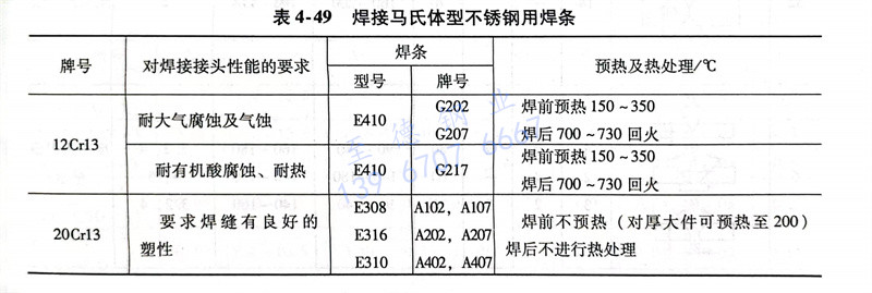 它是馬氏體(ti)型不銹鋼常用的(de)(de)一種焊(han)(han)接方法(fa),焊(han)(han)條電弧(hu)焊(han)(han)所(suo)選用焊(han)(han)條見表4-49。焊(han)(han)接采用大(da)的(de)(de)熱輸入,即(ji)較大(da)的(de)(de)焊(han)(han)接電流,緩慢的(de)(de)冷卻(que)速度。