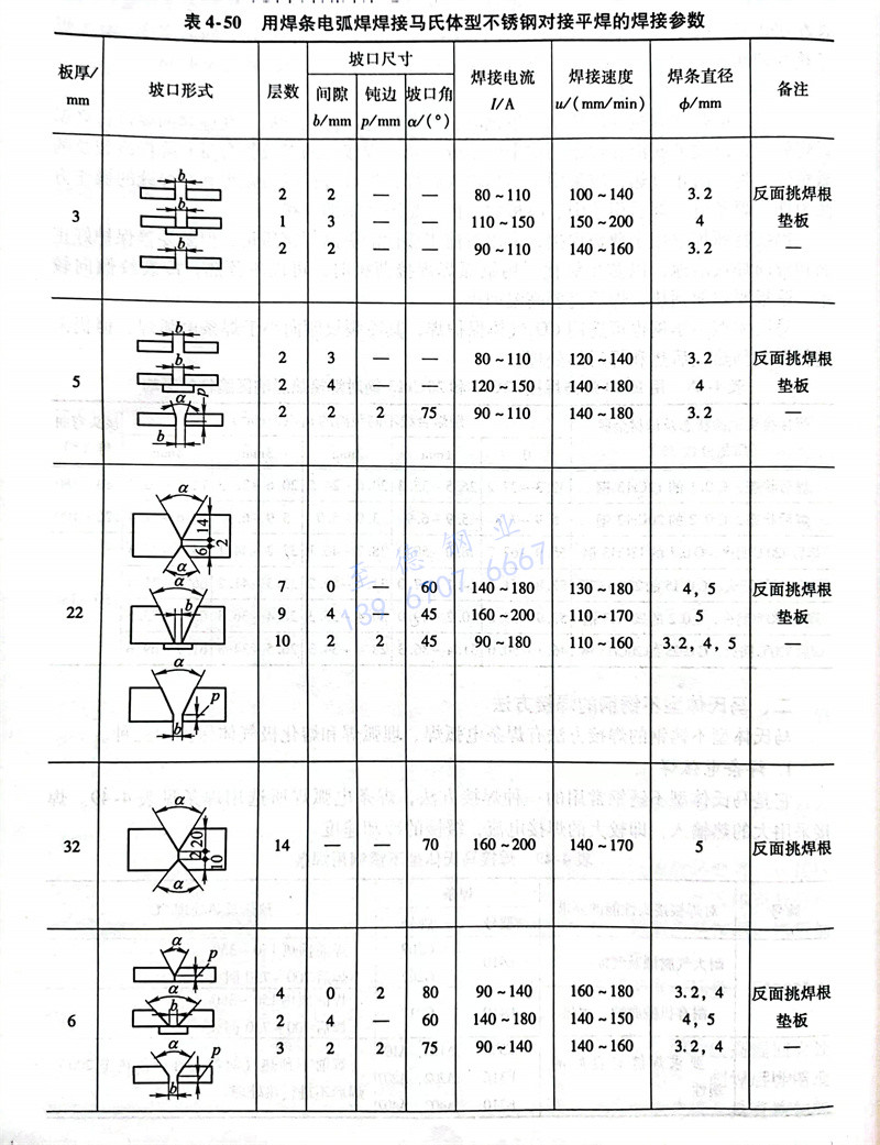 馬氏(shi)體不銹鋼對(dui)接平焊用焊條電(dian)弧焊的焊接參數(shu)見表(biao)4-50