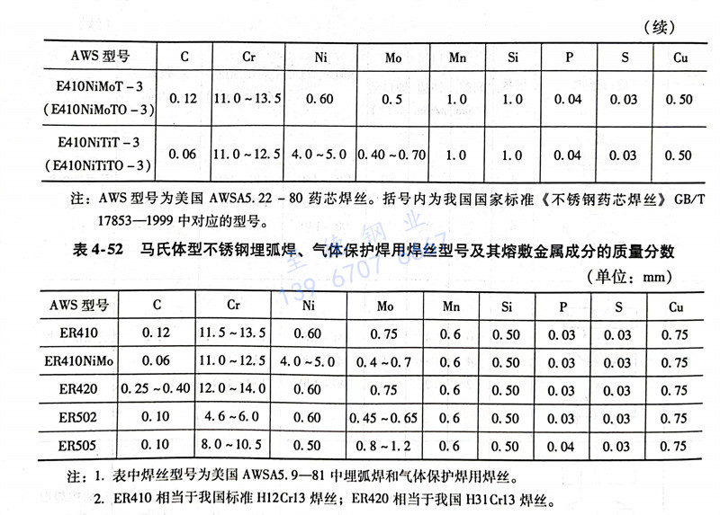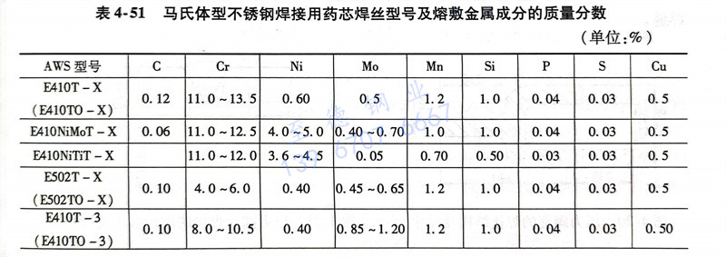 除了(le)采(cai)用(yong)焊(han)(han)(han)(han)條電弧焊(han)(han)(han)(han)外(wai),可以(yi)用(yong)藥(yao)芯焊(han)(han)(han)(han)絲焊(han)(han)(han)(han)接馬氏體型不銹鋼(gang),所(suo)用(yong)藥(yao)芯焊(han)(han)(han)(han)絲及熔(rong)敷金(jin)屬(shu)成分見(jian)表4-51,也可以(yi)用(yong)埋弧焊(han)(han)(han)(han)和氣體保(bao)護焊(han)(han)(han)(han)焊(han)(han)(han)(han)接馬氏體不銹鋼(gang),它(ta)們的(de)焊(han)(han)(han)(han)絲型號及熔(rong)敷金(jin)屬(shu)成分見(jian)表4-52。其(qi)焊(han)(han)(han)(han)縫金(jin)屬(shu)成分與藥(yao)芯焊(han)(han)(han)(han)絲熔(rong)敷金(jin)屬(shu)成分相比,除了(le)Si、Cu、Mn含(han)量有些區別外(wai),其(qi)他(ta)合金(jin)元素含(han)量基本一致。