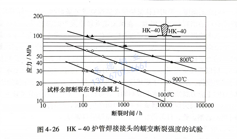 用于(yu)HK-40爐(lu)(lu)管焊(han)(han)接(jie)(jie)(jie)的(de)(de)焊(han)(han)接(jie)(jie)(jie)材料見表4-64。其中(zhong)TGS-310HSA 實芯(xin)焊(han)(han)絲(si)(si)具有(you)良(liang)好的(de)(de)焊(han)(han)接(jie)(jie)(jie)性,同時也基本具備了HK-40爐(lu)(lu)管在高(gao)溫長期(qi)服役過(guo)程所需要的(de)(de)蠕(ru)(ru)變斷(duan)裂(lie)(lie)強(qiang)(qiang)度。該焊(han)(han)絲(si)(si)中(zhong)的(de)(de)鎳含量(liang)(liang)較高(gao)[w(Ni)≥24%],所焊(han)(han)成(cheng)的(de)(de)焊(han)(han)縫(feng)金(jin)屬(shu)(shu)(shu)(shu)在650~900℃溫度范圍(wei)內長期(qi)服役不會有(you)局部σ相析出。該焊(han)(han)絲(si)(si)所得的(de)(de)全焊(han)(han)縫(feng)金(jin)屬(shu)(shu)(shu)(shu)(熔敷(fu)金(jin)屬(shu)(shu)(shu)(shu))在高(gao)溫試驗的(de)(de)蠕(ru)(ru)變斷(duan)裂(lie)(lie)強(qiang)(qiang)度與(yu)鑄態HK-40爐(lu)(lu)管的(de)(de)比(bi)較,如圖4-25所示。從圖中(zhong)可以看出,當斷(duan)裂(lie)(lie)時間相同時,熔敷(fu)金(jin)屬(shu)(shu)(shu)(shu)的(de)(de)蠕(ru)(ru)變斷(duan)裂(lie)(lie)強(qiang)(qiang)度高(gao)于(yu)爐(lu)(lu)管。用這(zhe)種焊(han)(han)絲(si)(si)焊(han)(han)成(cheng)的(de)(de)焊(han)(han)接(jie)(jie)(jie)接(jie)(jie)(jie)頭進(jin)行了蠕(ru)(ru)變斷(duan)裂(lie)(lie)強(qiang)(qiang)度試驗,結果如圖4-26所示,所有(you)的(de)(de)試樣均(jun)斷(duan)裂(lie)(lie)于(yu)基本金(jin)屬(shu)(shu)(shu)(shu)上。這(zhe)類高(gao)合金(jin)材料焊(han)(han)絲(si)(si)的(de)(de)硫和(he)磷含量(liang)(liang)很(hen)低,對(dui)提高(gao)焊(han)(han)縫(feng)金(jin)屬(shu)(shu)(shu)(shu)抗裂(lie)(lie)性是(shi)有(you)益的(de)(de)。