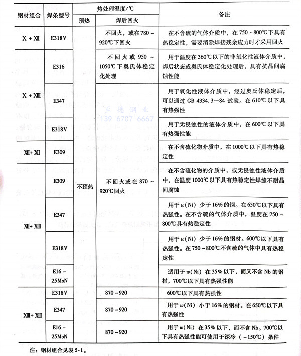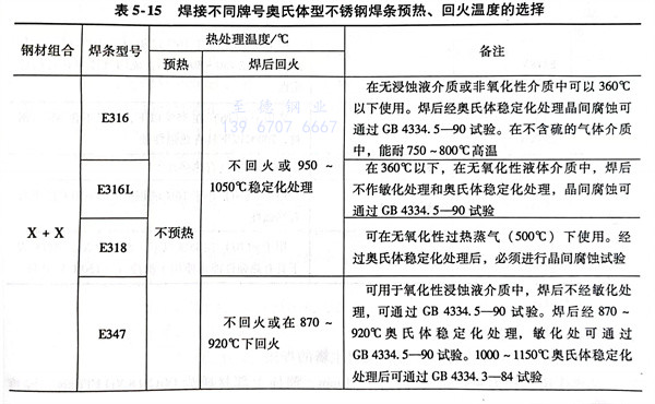 有關(guan)不(bu)同牌號的奧氏體型不(bu)銹鋼管焊接時(shi),焊條、預熱和(he)回火(huo)溫度的選擇見(jian)表5-15。
