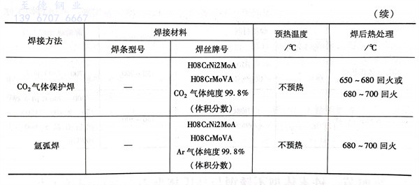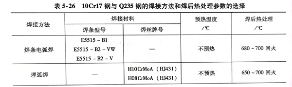 這兩種鋼的焊接方法可采用焊條電弧焊、埋弧焊、CO2氣體保護焊和氬弧焊等,其焊接材料、焊前預熱和焊后熱處理參數的選擇,見表5-26。