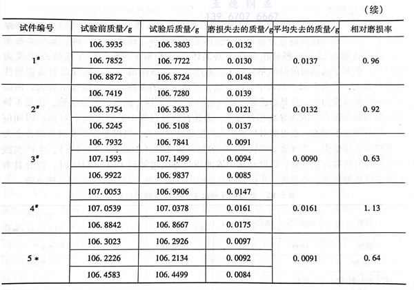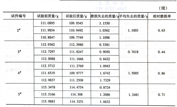 采用MLS-225型濕(shi)式橡膠輪磨(mo)粒磨(mo)損試(shi)驗機。材料的(de)耐磨(mo)性(xing)能用磨(mo)損失去(qu)(qu)質(zhi)量(liang)(liang)來衡(heng)量(liang)(liang),算出(chu)磨(mo)損前后試(shi)件的(de)平均質(zhi)量(liang)(liang)差。與試(shi)驗時用水輪機母材相(xiang)比(bi)。對比(bi)件失去(qu)(qu)的(de)質(zhi)量(liang)(liang)與測量(liang)(liang)件失去(qu)(qu)的(de)質(zhi)量(liang)(liang)之(zhi)比(bi)來衡(heng)量(liang)(liang)該(gai)堆焊層的(de)相(xiang)對耐磨(mo)性(xing)。相(xiang)對磨(mo)損率=對比(bi)材料的(de)磨(mo)損量(liang)(liang)/0#試(shi)樣材料的(de)磨(mo)損量(liang)(liang)。試(shi)驗結果見表5-80。