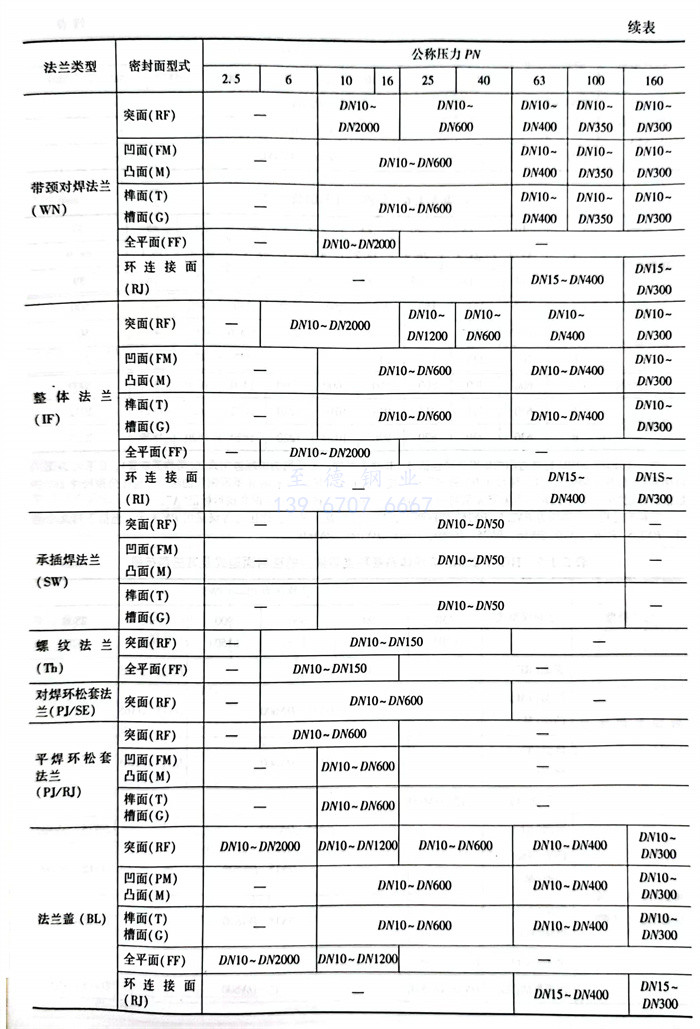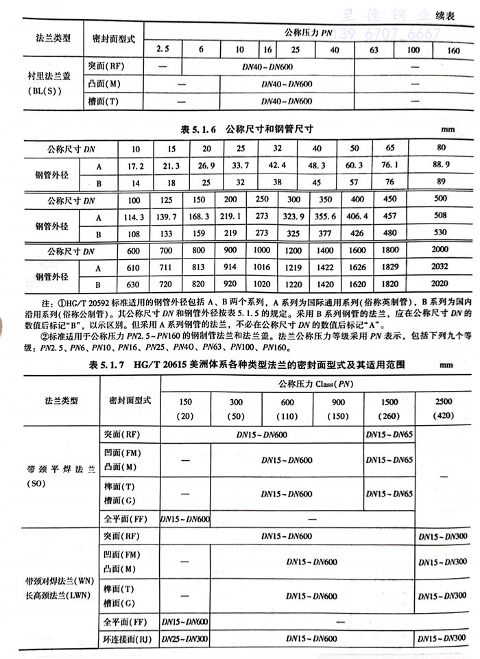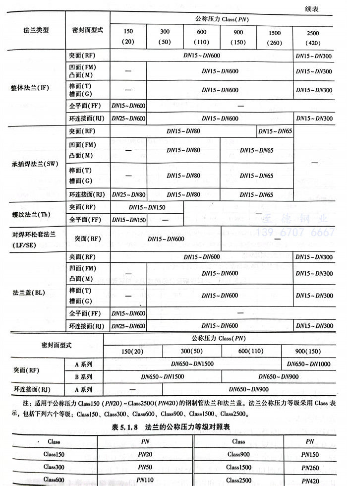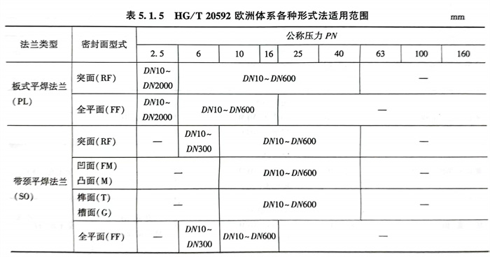 表示管法蘭特征的應是法蘭類型、公稱壓力、密封面形(xing)式、公稱直徑和材質。所(suo)有(you)法蘭標(biao)準(zhun)均(jun)有(you)各自的范圍,因(yin)此必須查找有(you)關法蘭標(biao)準(zhun)核(he)實后方能正確選用(yong)所(suo)需要的法蘭。見(jian)表5.1.5~表5.1.10。