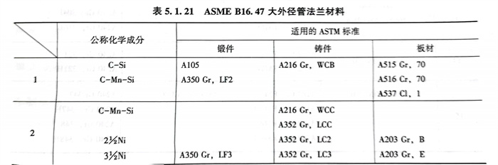 5. ASME B16.47大外徑管法(fa)蘭(lan)材料見表5.1.21,法(fa)蘭(lan)蓋除(chu)可(ke)用(yong)鋼(gang)板外還(huan)可(ke)用(yong)所列鍛件(jian)材料鑄(zhu)造(zao)或鍛造(zao)。
