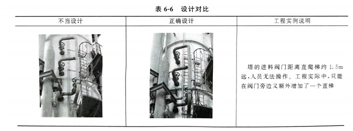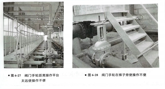 ④. 布置在操作平(ping)(ping)臺(tai)周圍的閥門(men)的中心距操作平(ping)(ping)臺(tai)邊緣不宜(yi)大于450mm,當閥桿和手(shou)輪伸(shen)入平(ping)(ping)臺(tai)上(shang)方且高度小于2m時,應注意不影(ying)響操作和通行(xing)(圖6-27、圖6-28、表6-6)。